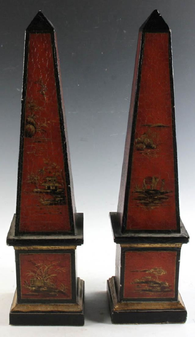 Pair of Asian Chinoiserie-decorated obelisks, 24" H x 5 1/2". Provenance: National City, California estate.