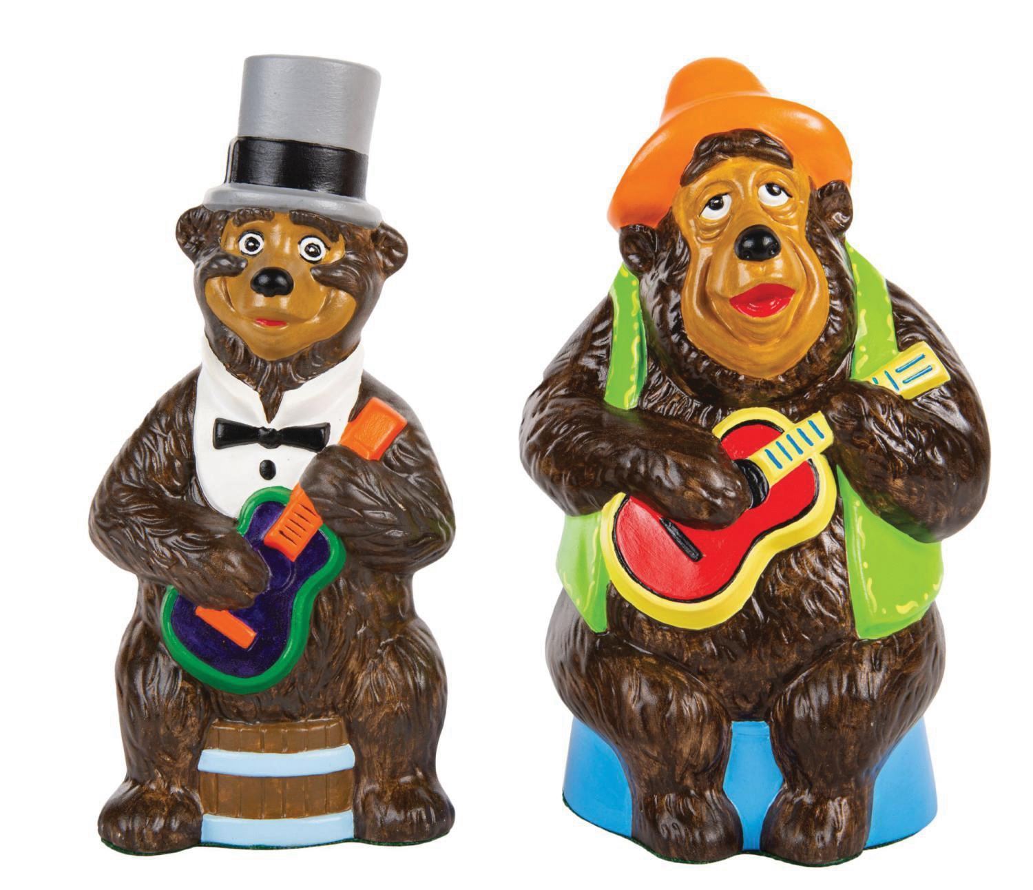 (Disneyland, 1970s) A pair of Country Bear hand-painted ceramic figures of Henry and Big Al. Each souvenir figure captures the likeness of a memorable Country Bear Jamboree Cast Member strummin' "in the good ol' key of ‘G'" with a Walt Disney Productions backstamp. Measuring under 10"x5.5" in diameter, each souvenir figure displays in very good condition, with little wear.