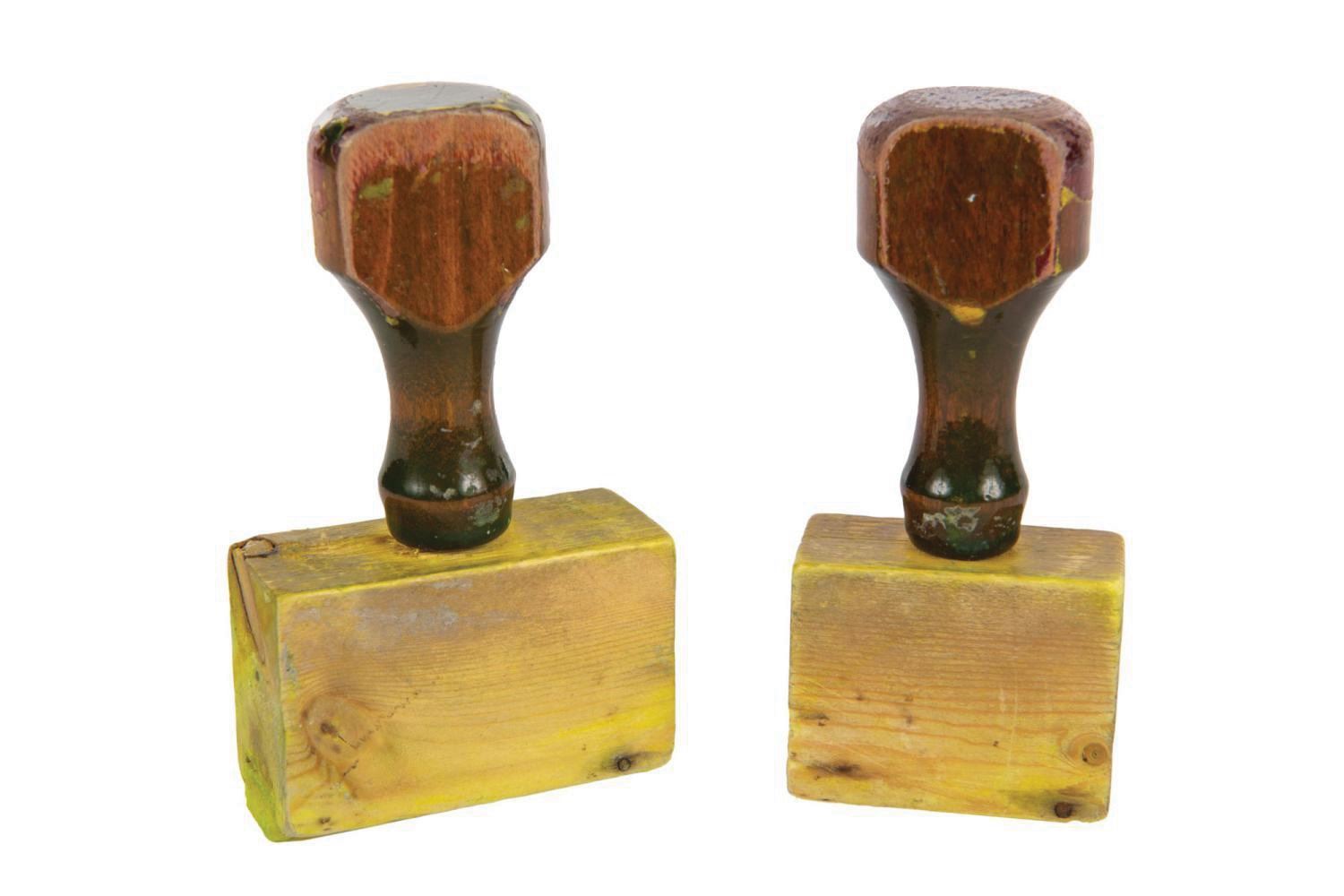 (California Adventure, c.2001) A pair of hand stamps used to mark Park guests for re-entry. To discourage misuse, Disney alternated stamps daily, with these stamps reading "Superstar" and "Eureka." The re-entry stamps are constructed of wood and rubber with a wooden knob handle. They measure 4" long and are in good condition with expected surface wear and ink color staining from use. The rubber pads have partially dried with age.