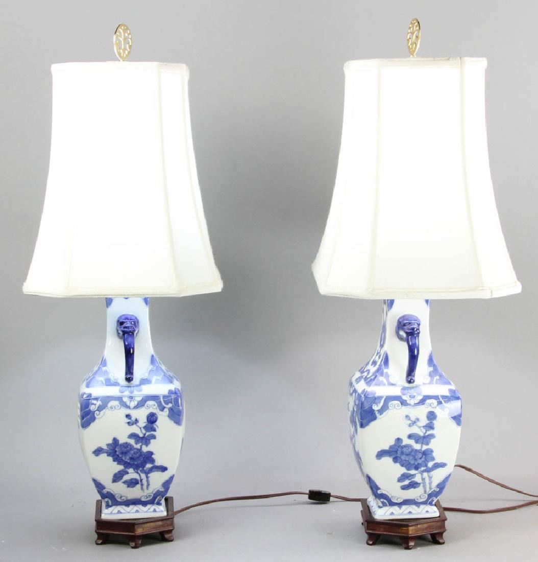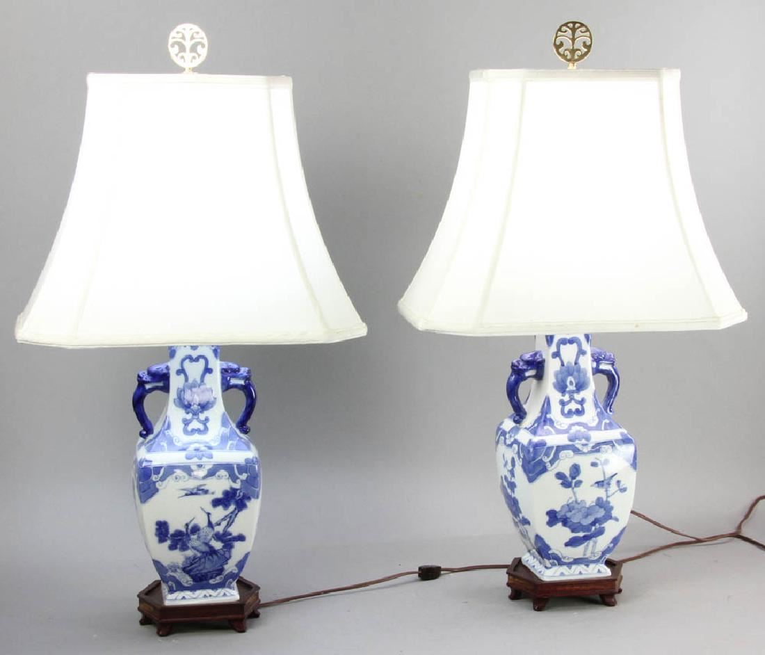 Pair of Chinese blue and white porcelain lamps, 29" x 6". Provenance: Boyton Beach, Florida estate.
