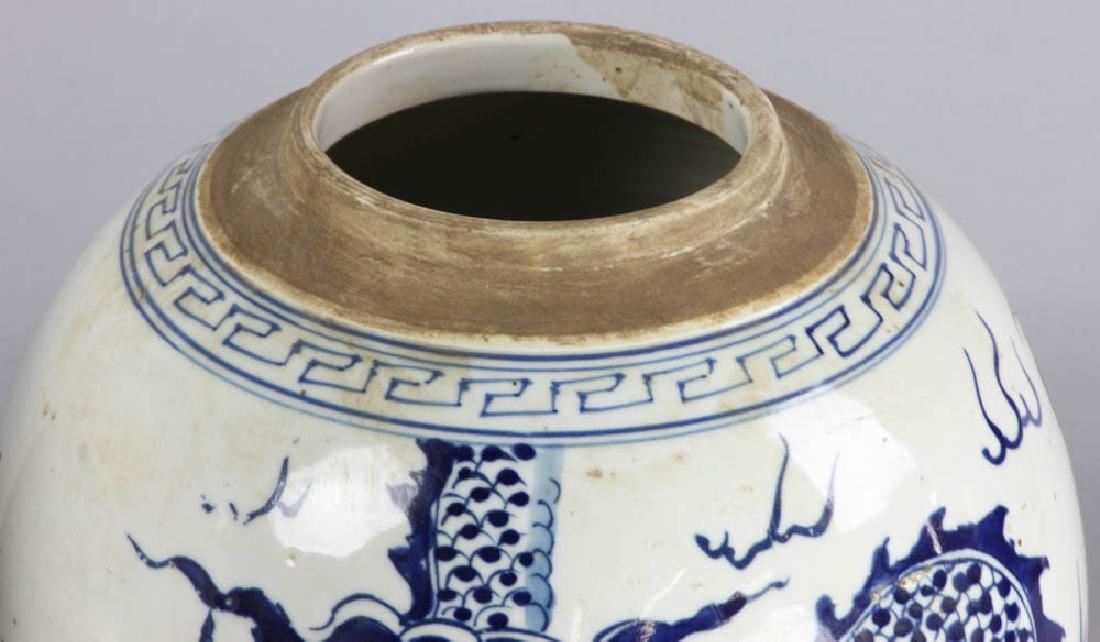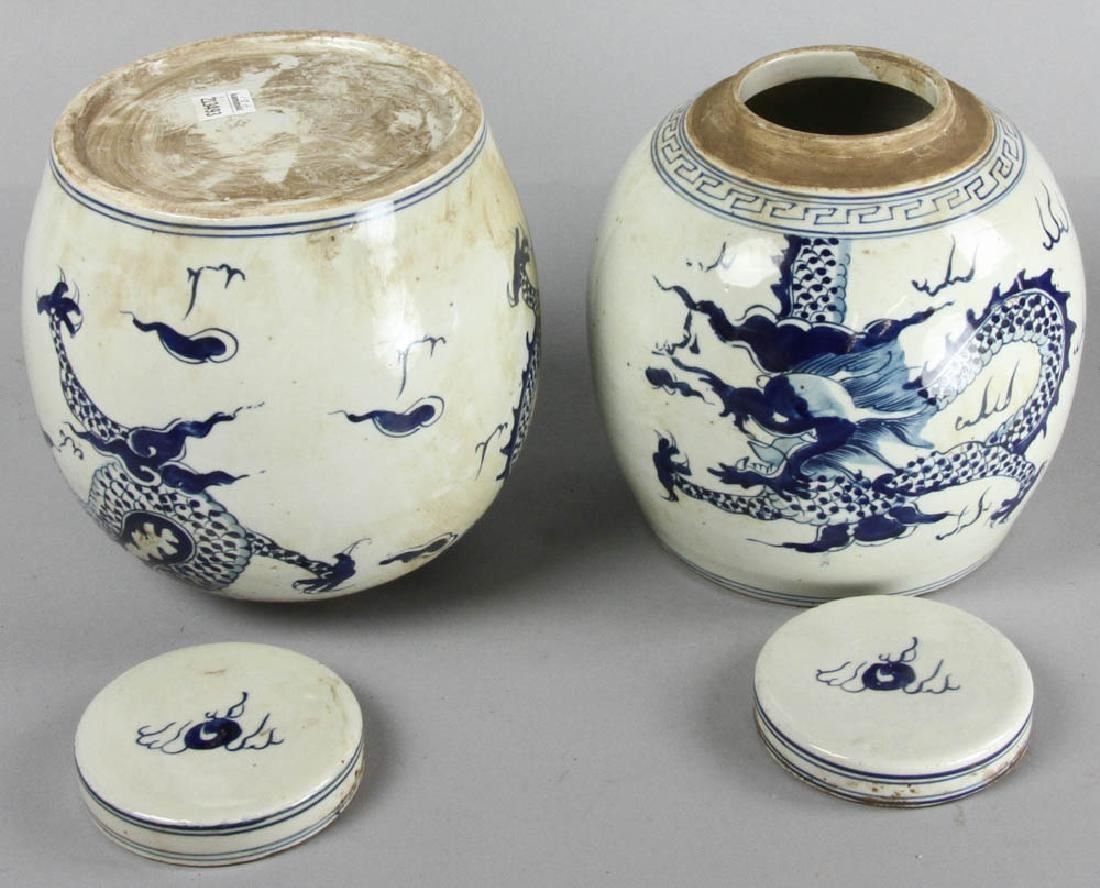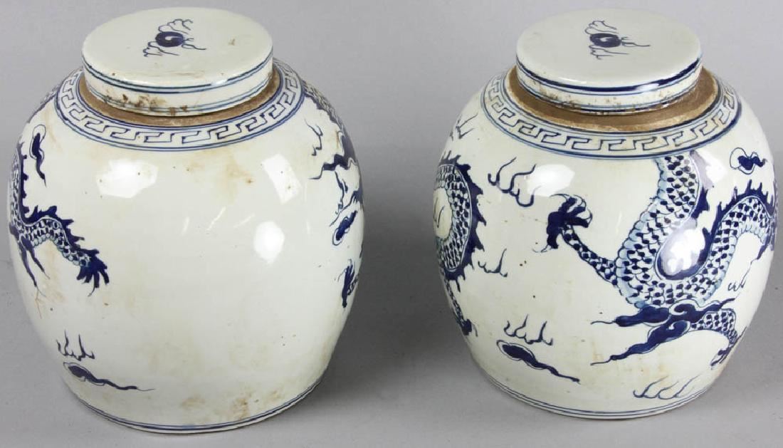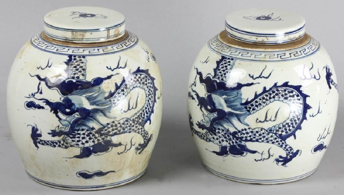 Pair of Chinese porcelain covered jars having dragon scenes, 9 1/2" H x 9" diameter. Provenance: Wakefield, Massachusetts estate.