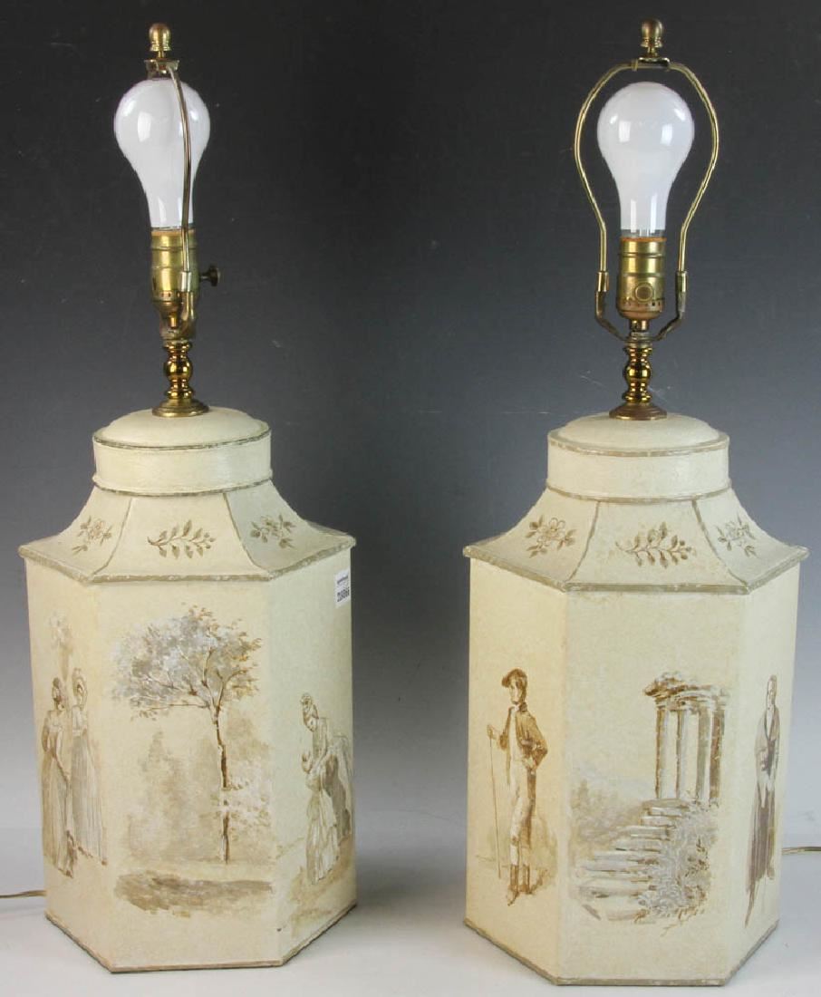 Pair of Chinese paint-decorated tea tins converted to lamps, 20 " H x 9 1/4" diameter. Provenance: Vero Beach, Florida estate.