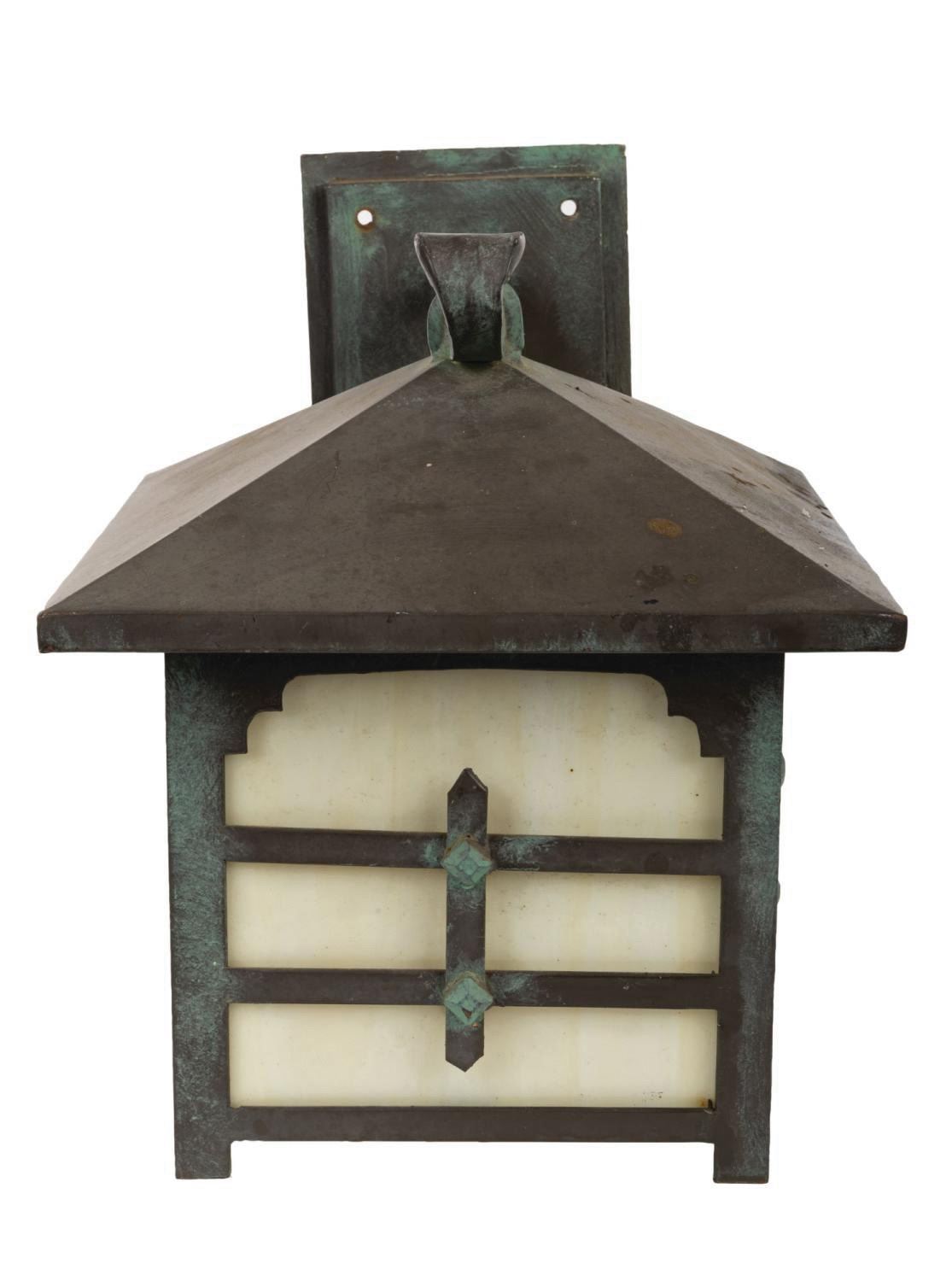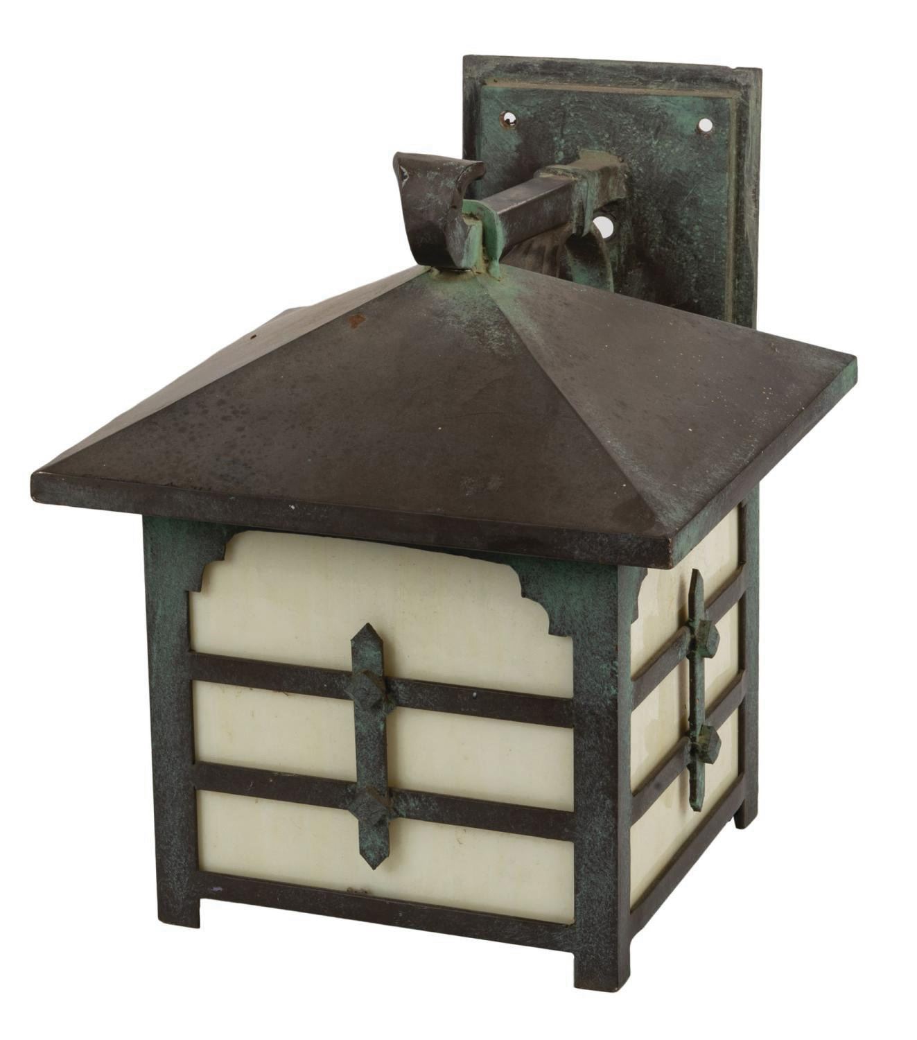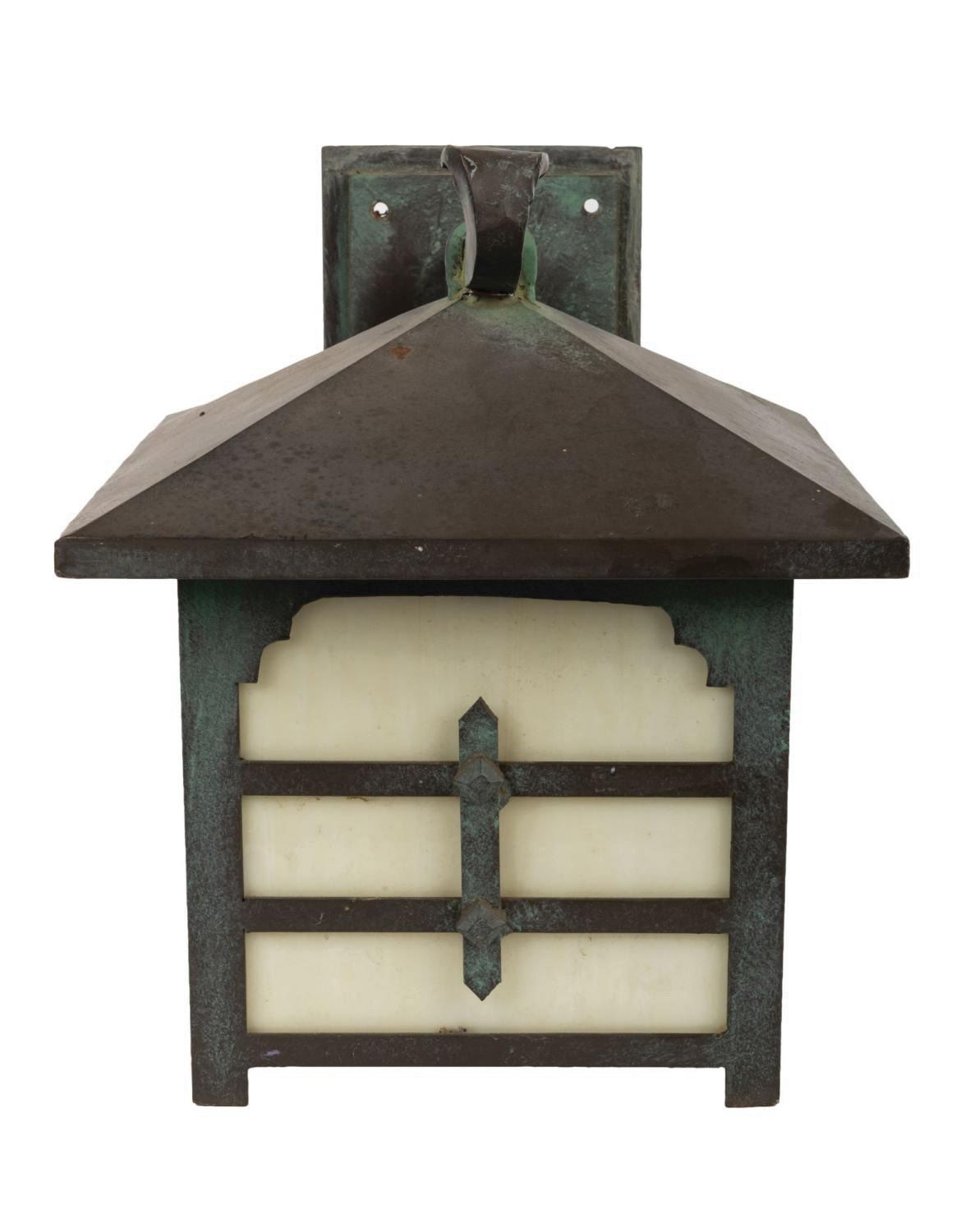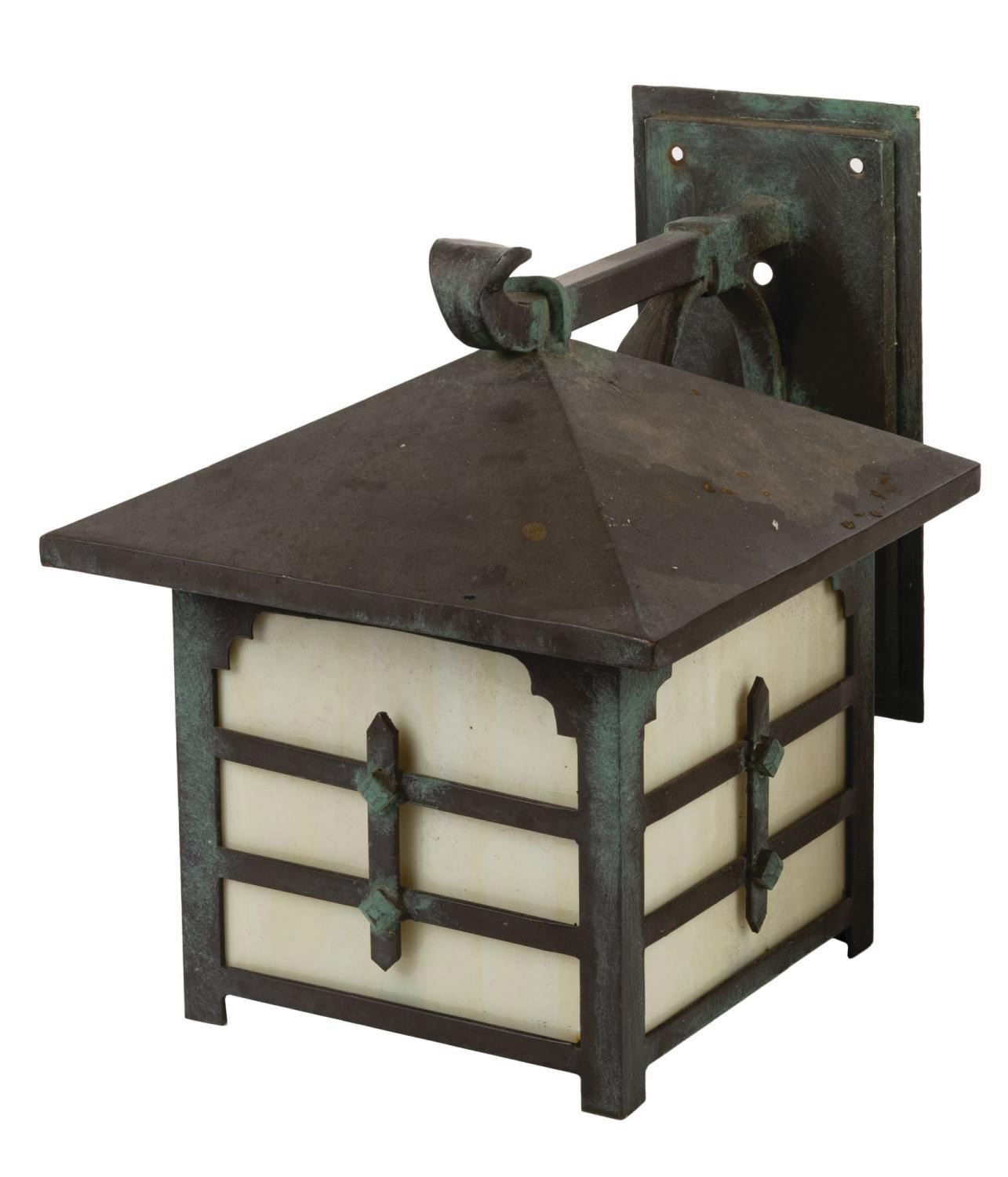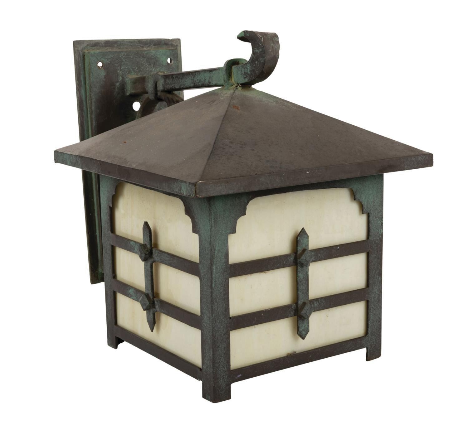 (Grand Californian, c.2000s) A pair of outdoor lamps used at the Grand Californian Hotel. The wall-mounted outdoor fixtures were produced used in the Main Entry West Block of Disney's Grand Californian Hotel at the Disneyland Resort. Measuring approximately 14" tall and 15"x11", the sturdy metal-frame craftsman style lamps display in very good condition. The lamps are believed to be in functioning condition, however they will need to be rewired, as the cords were cut at the time of their removal. The back glass panel is absent on one of the lamps.