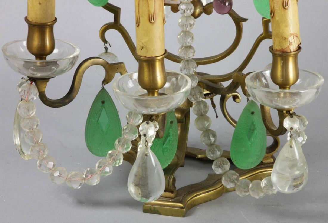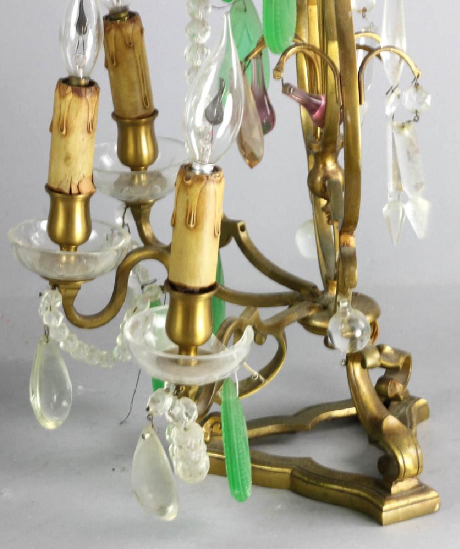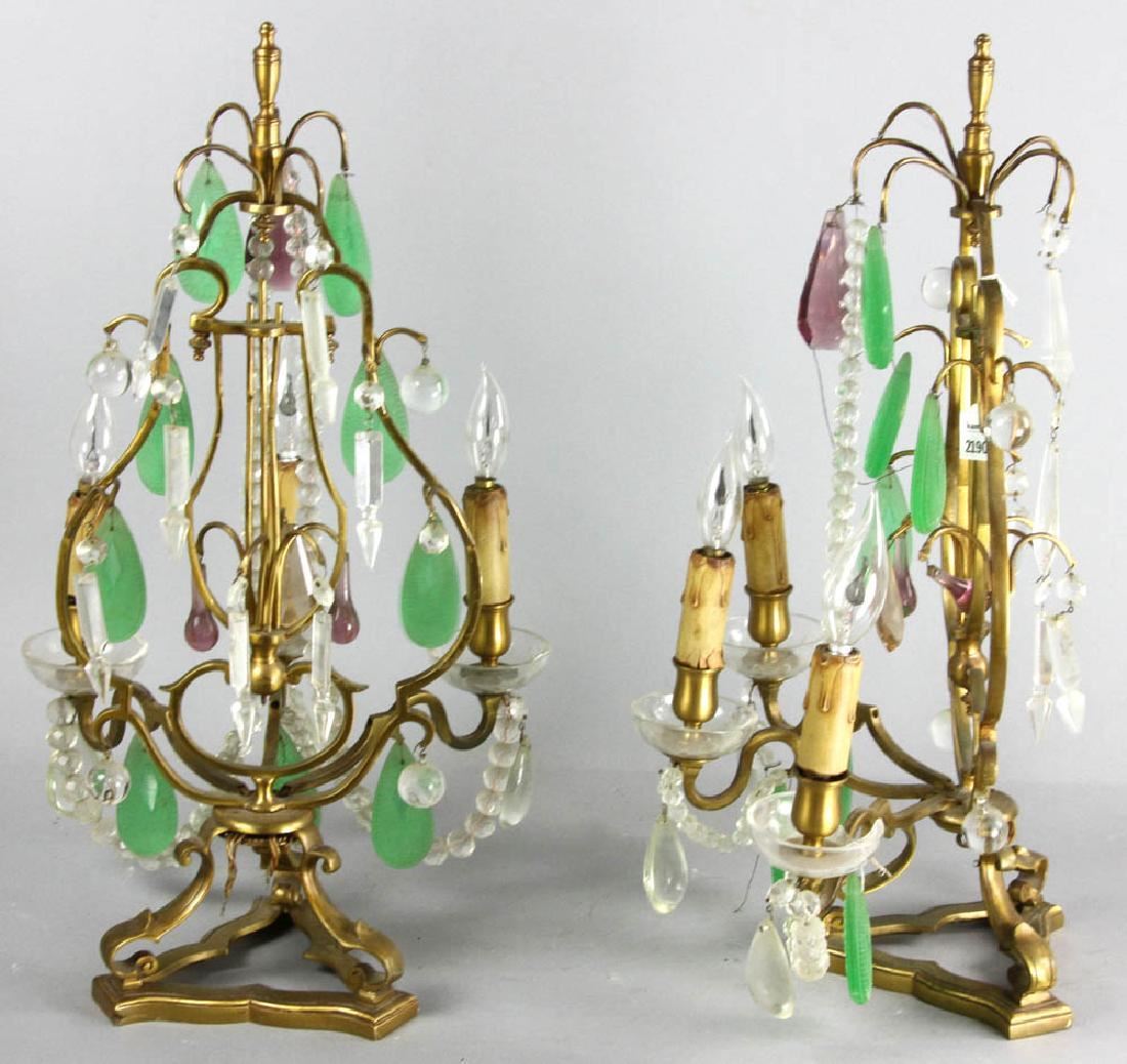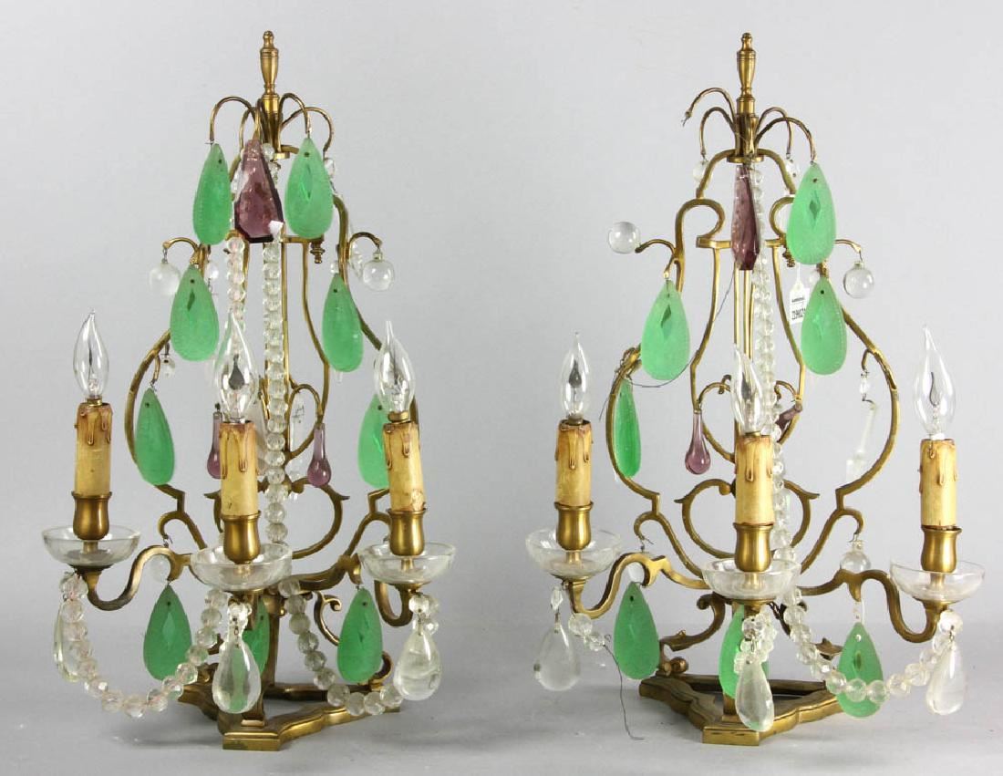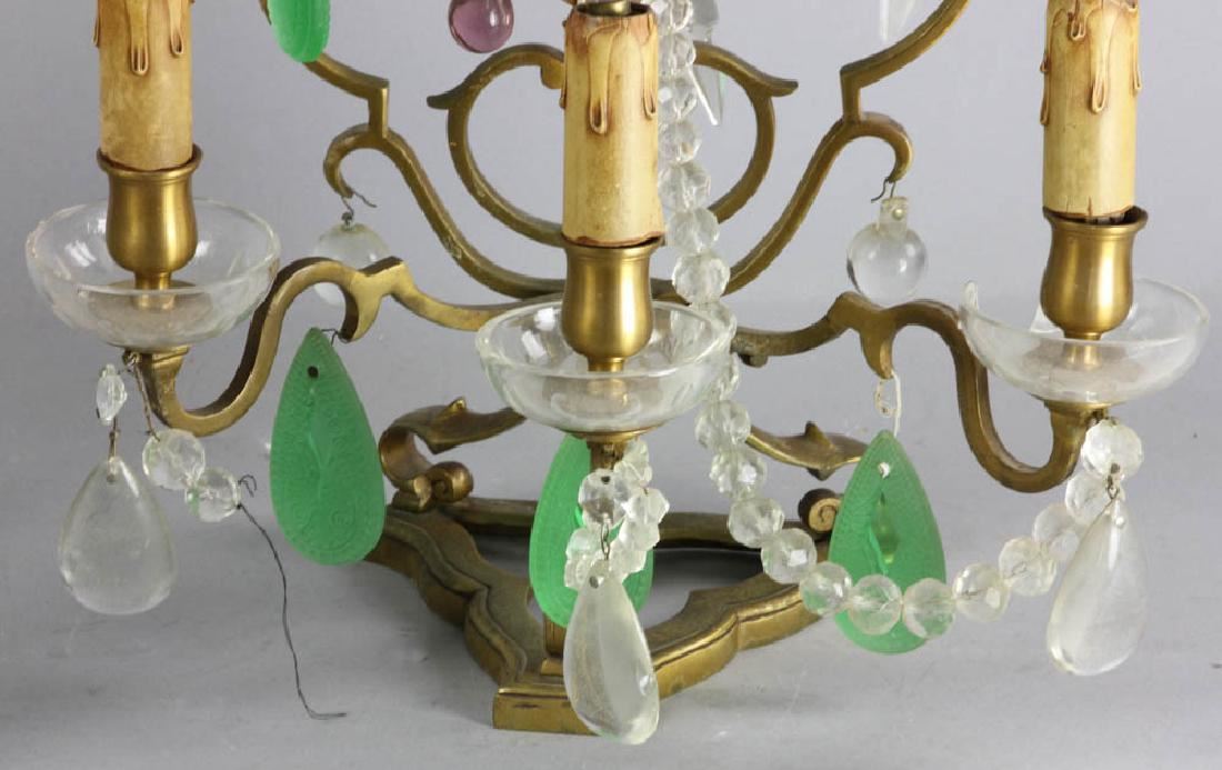 Pair of early 20th century Girandoles, bronze with crystal prisms 21 1/2" x 13". Damage to bobeche. Provenance: West Palm Beach, Florida estate.