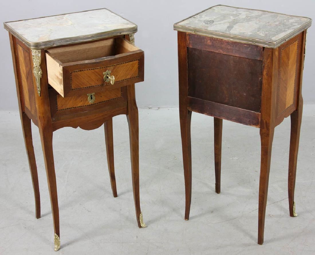 Pair of French transitional tulipwood mahogany two-drawer marble-top bedside chests, circa 1920, 29" H x 14" W x 11" D. Provenance: New York estate.