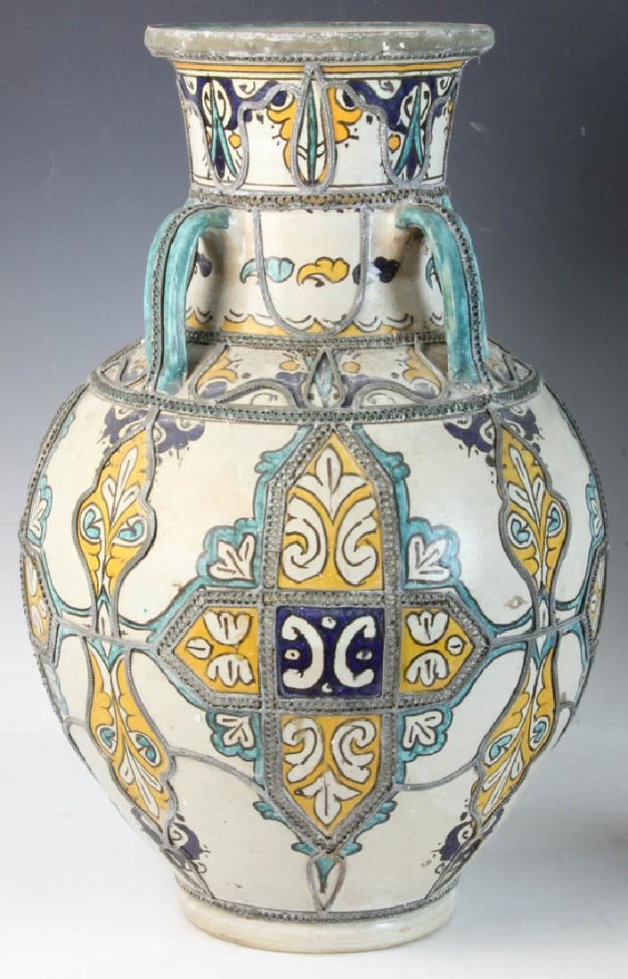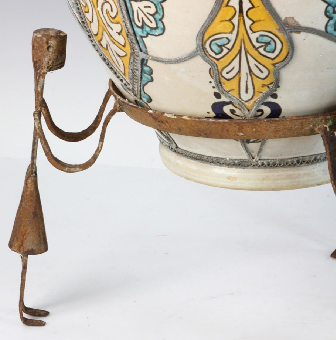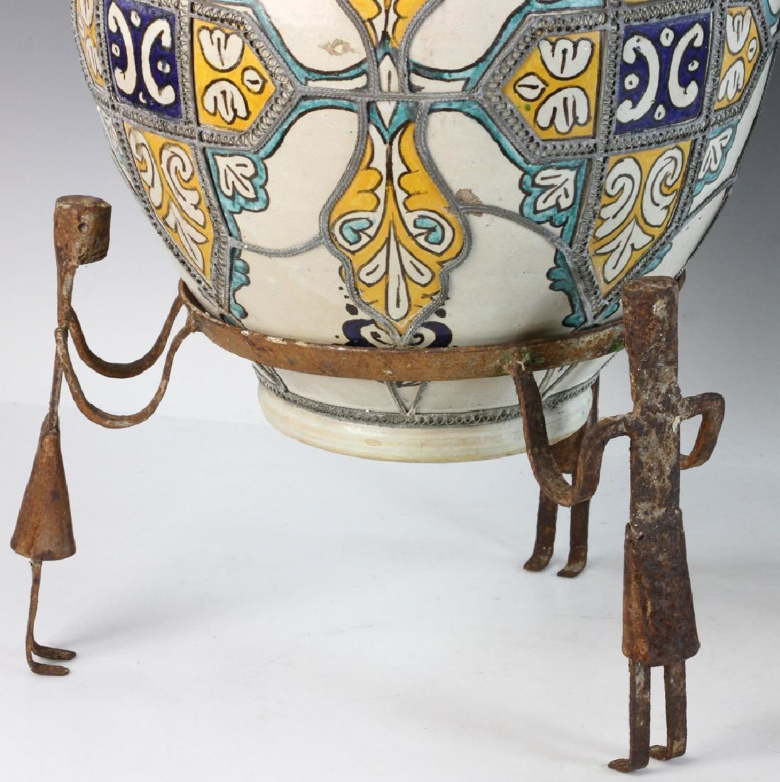 Pair of Islamic glazed pottery urns on iron bases, 24" x 12". Provenance: Boyton Beach, Florida estate.