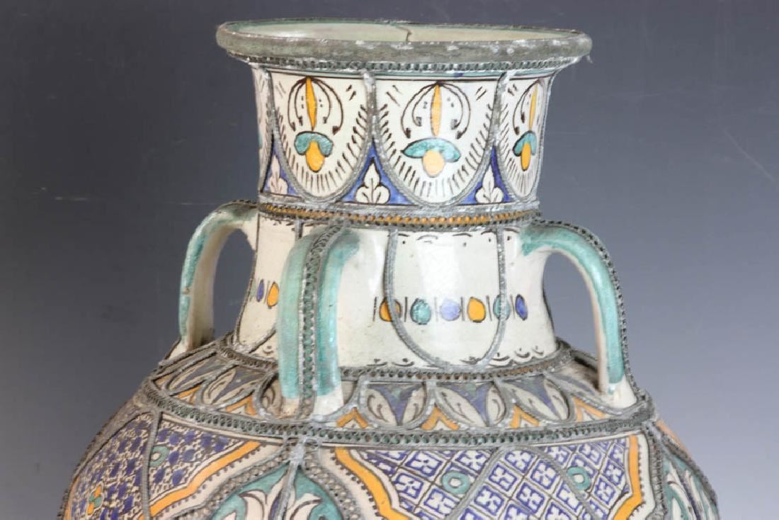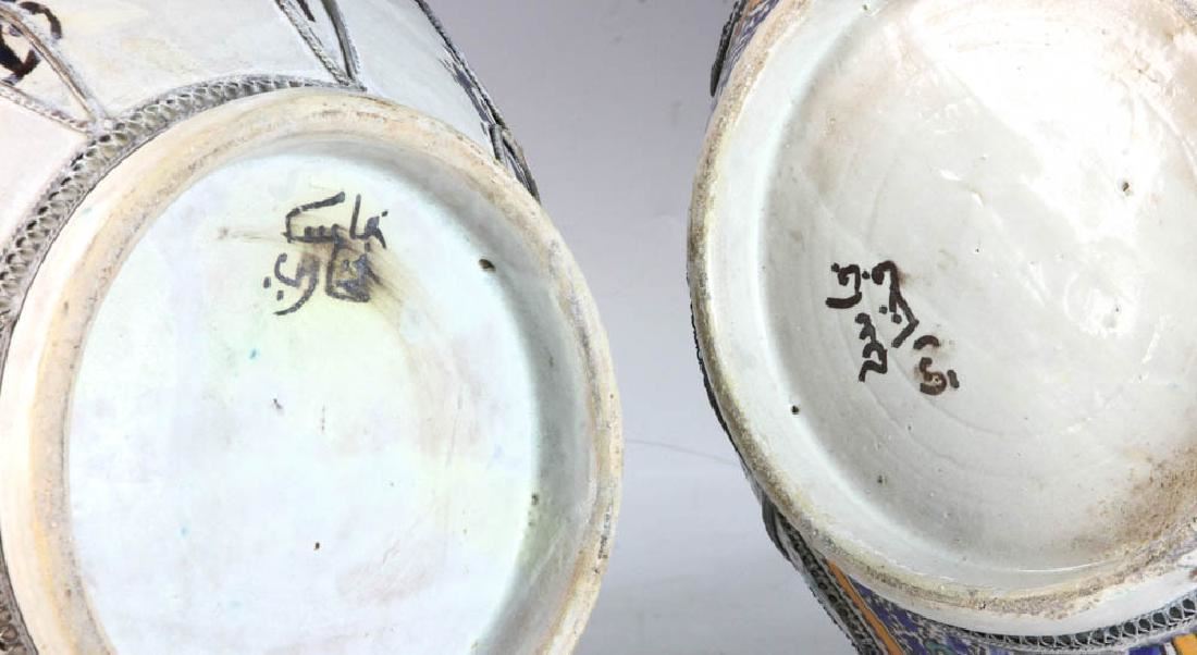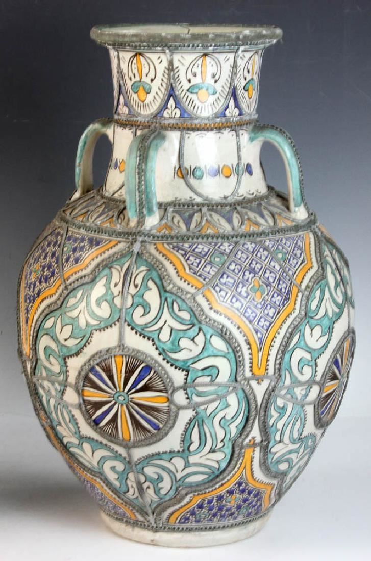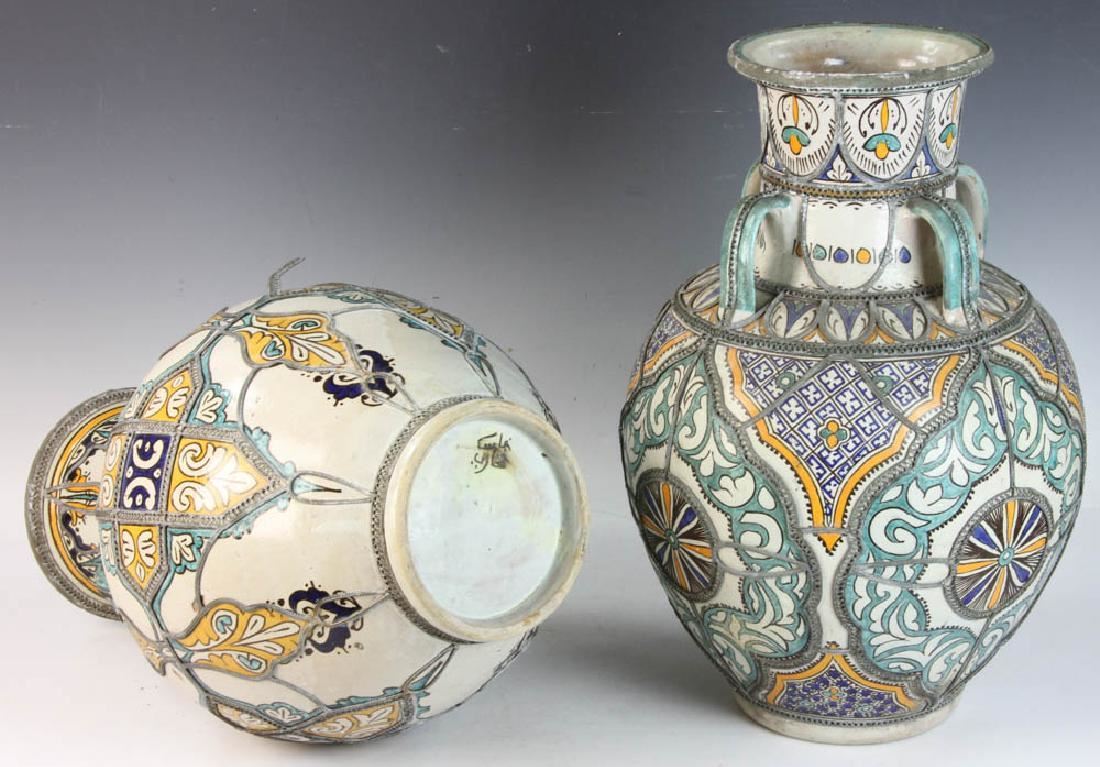 Pair of Islamic glazed pottery urns on iron bases, 24" x 12". Provenance: Boyton Beach, Florida estate.