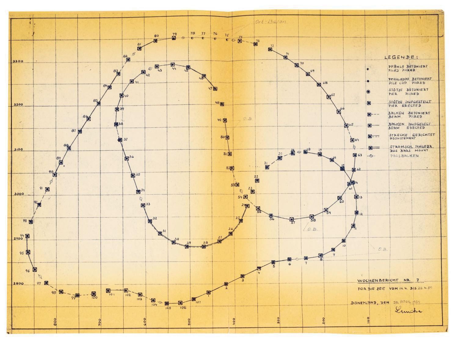 (Disneyland, 1959) A pair of plans relating to the pylons of the ALWEG Disneyland Monorail System at Disneyland. The pair of documents includes a site plan for the placement of 104 Monorail System pylons around the Submarine Lagoon and the rest of Tomorrowland, and a "Beam Production" schedule for March 16 to April 16, 1959. Both documents display a Disneyland Construction Department stamp on reverse, dated April 21, 1959. Measuring 13"x17.5" and 11"x8.5", the schematics display in good condition, with yellowing throughout from age.