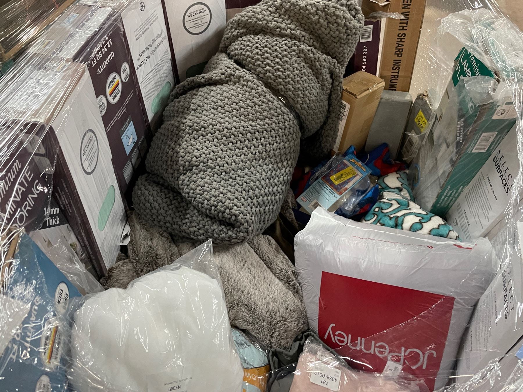 Pallet de madera de gran calidad junto a mixto de blancos ( Almohadas, cobijas, sabanas, etc...) de muy buena calidad.