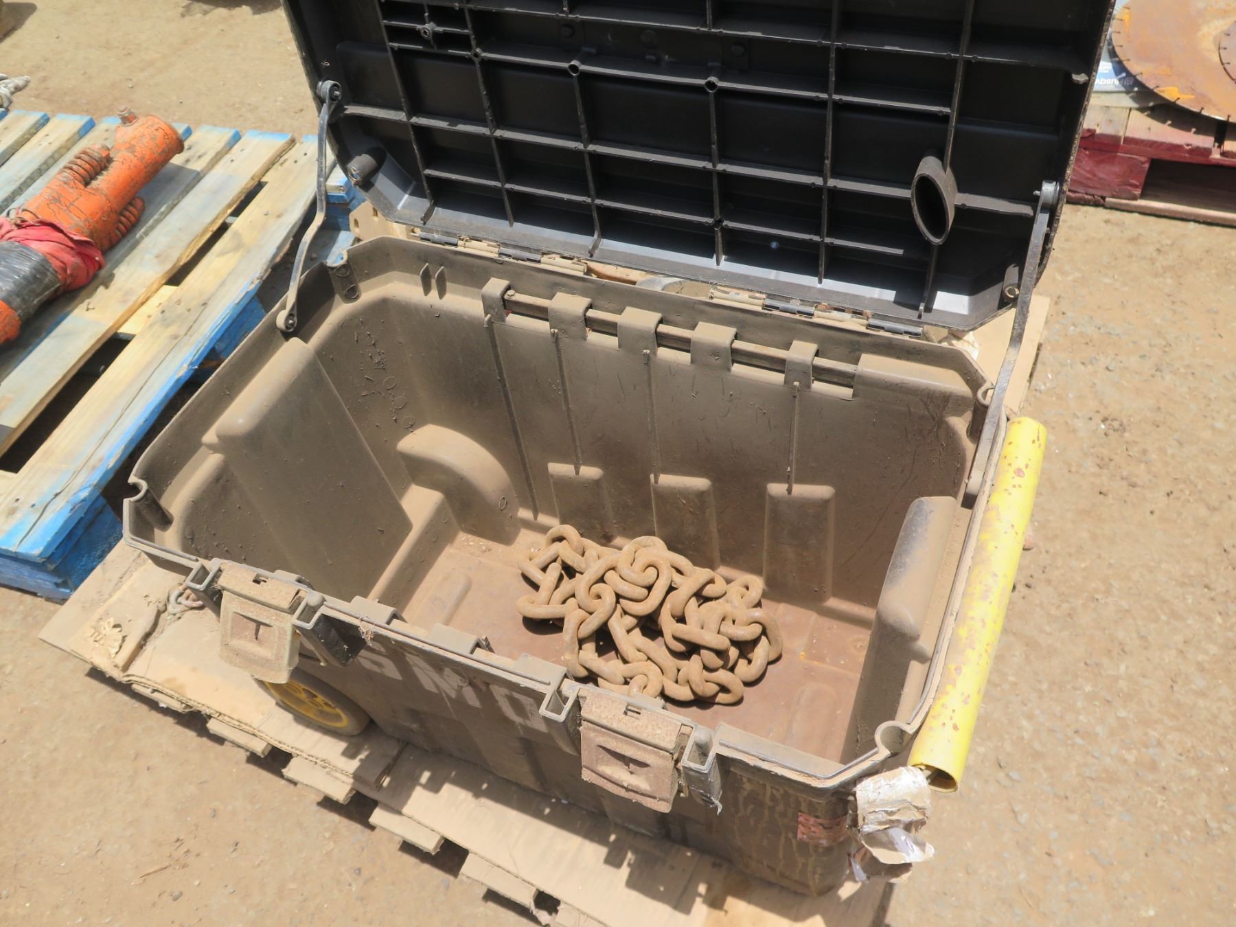 Pallet Large Plastic Bin & Misc Hardware & Rigging: Hooks, Shackles, Bases, Chain, etc