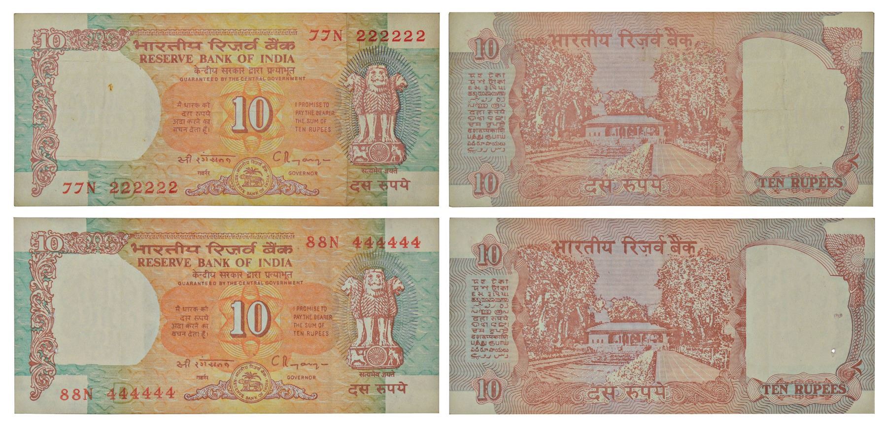 10 rupees, fancy number notes (2), shalimar garden series, ND (1992-1997), signed by C. Rangarajan, inset D, serial no.: 77N 222222 and 88N 444444, J&R 6.4.11.2D. (2 notes)