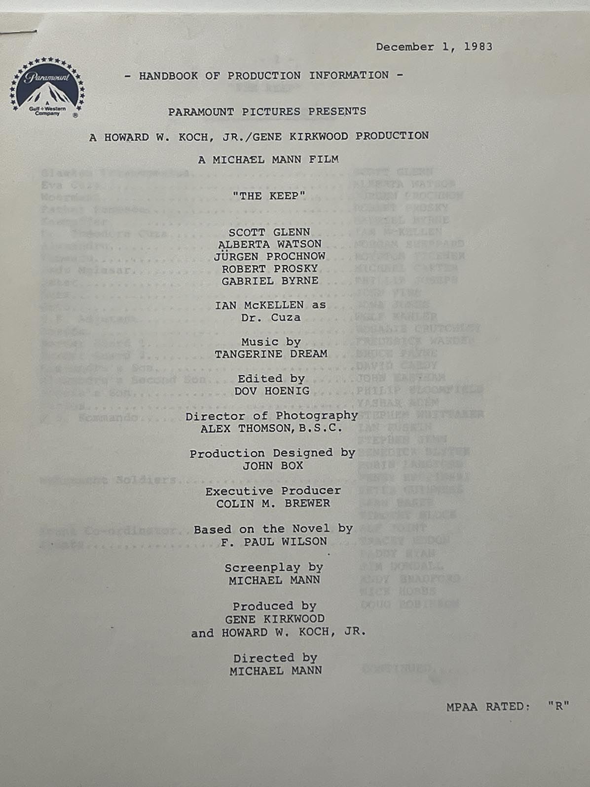 Paramount Pictures The Keep unsigned production info. 8x11 inches