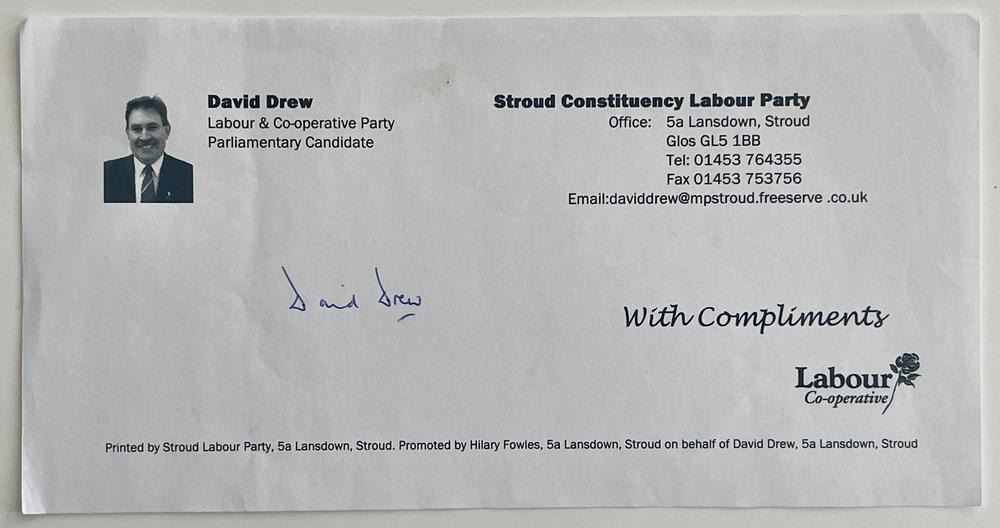 Parliamentary candidate David Drew signed note. 4x8 inches
