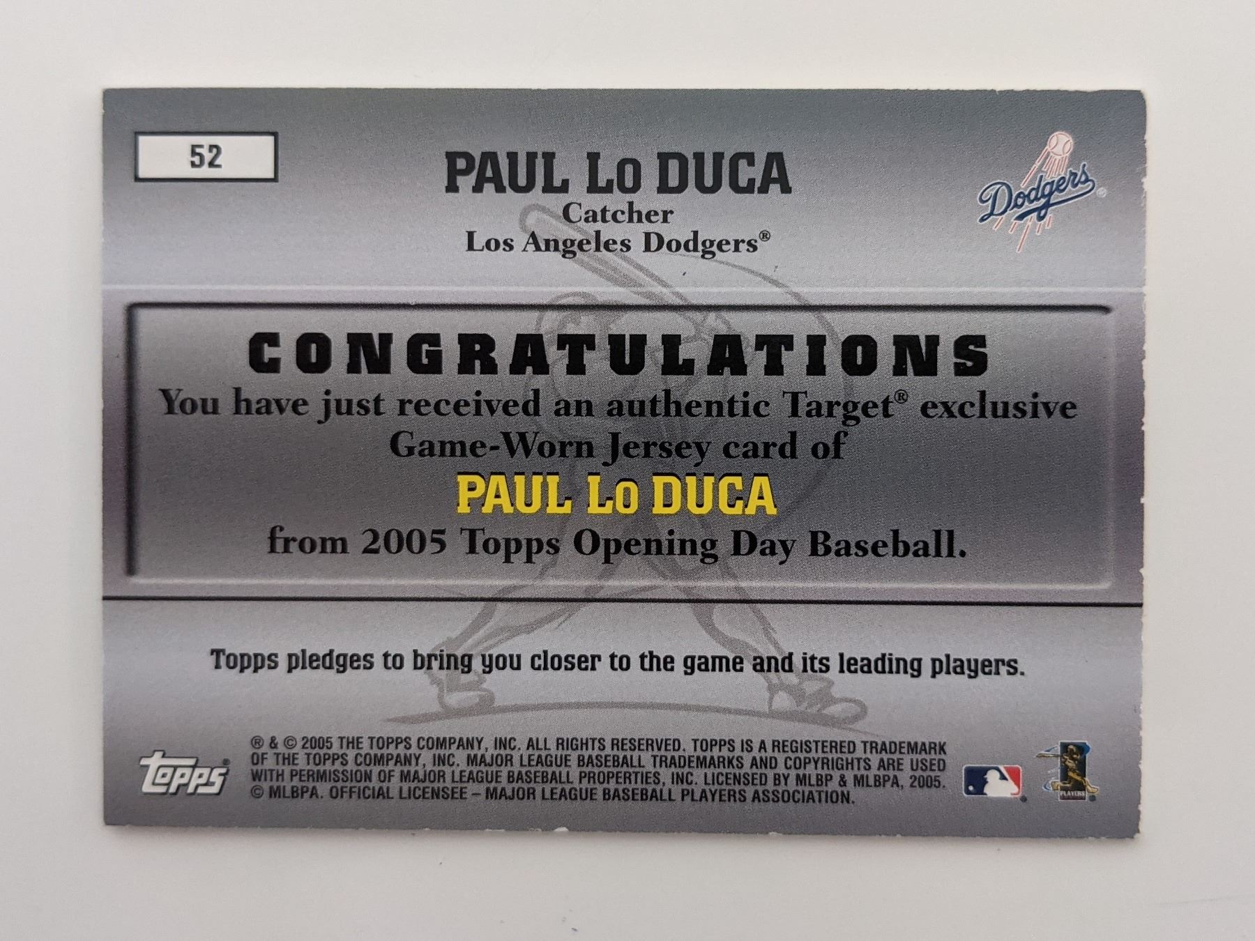 Paul Lo Duca Baseball Trading Card with Game Used Jersey Swatch - Topps Game Worn Jersey Collection #52 2005