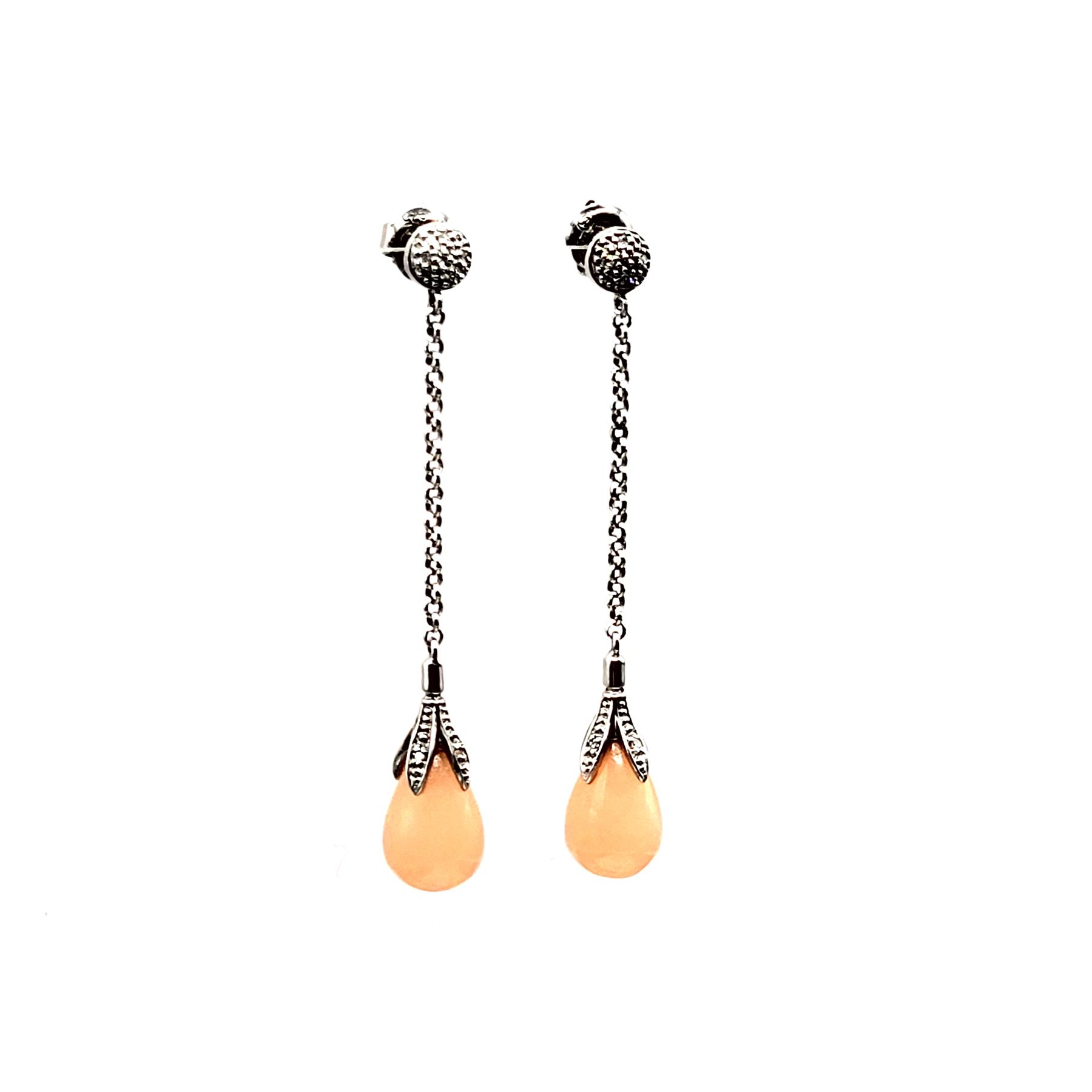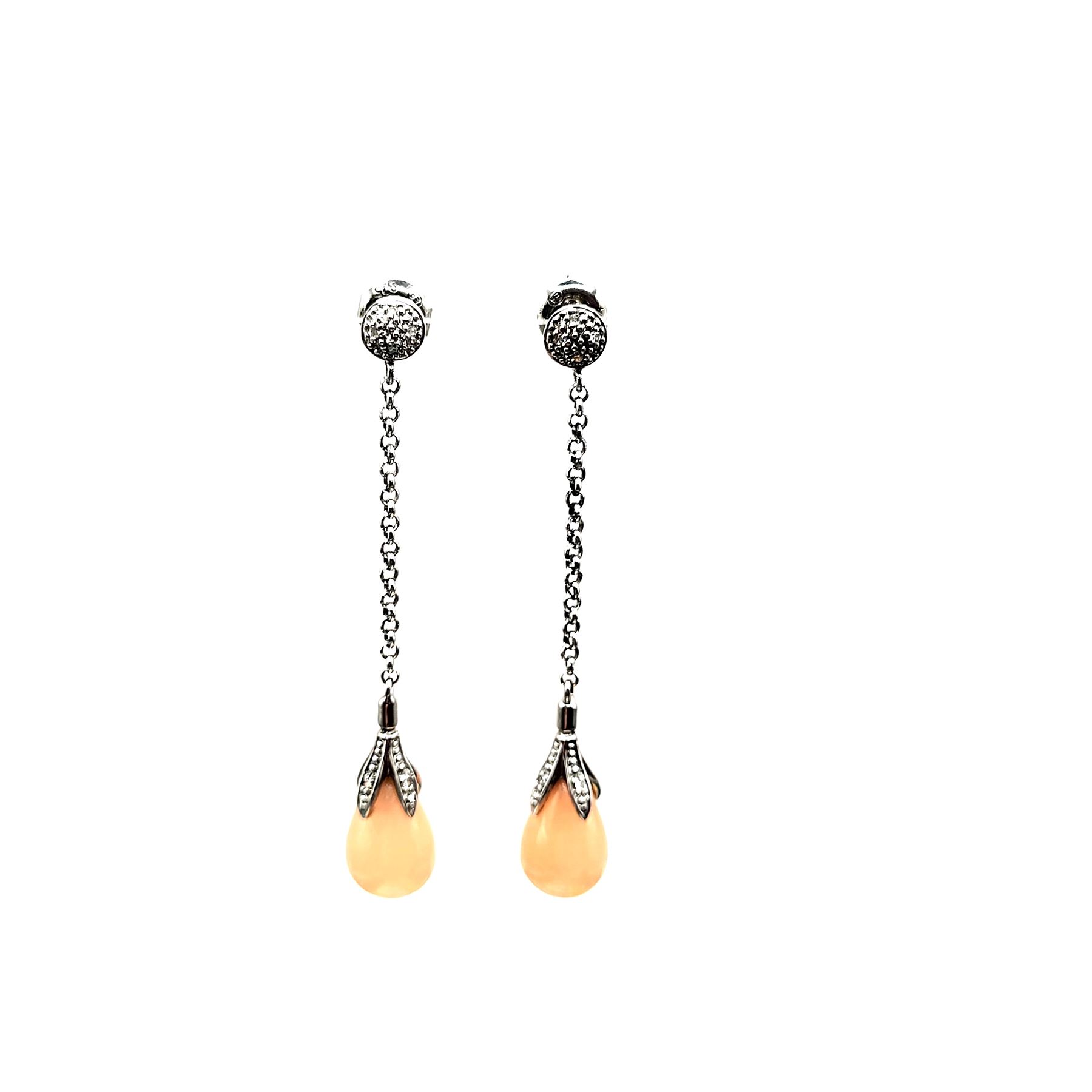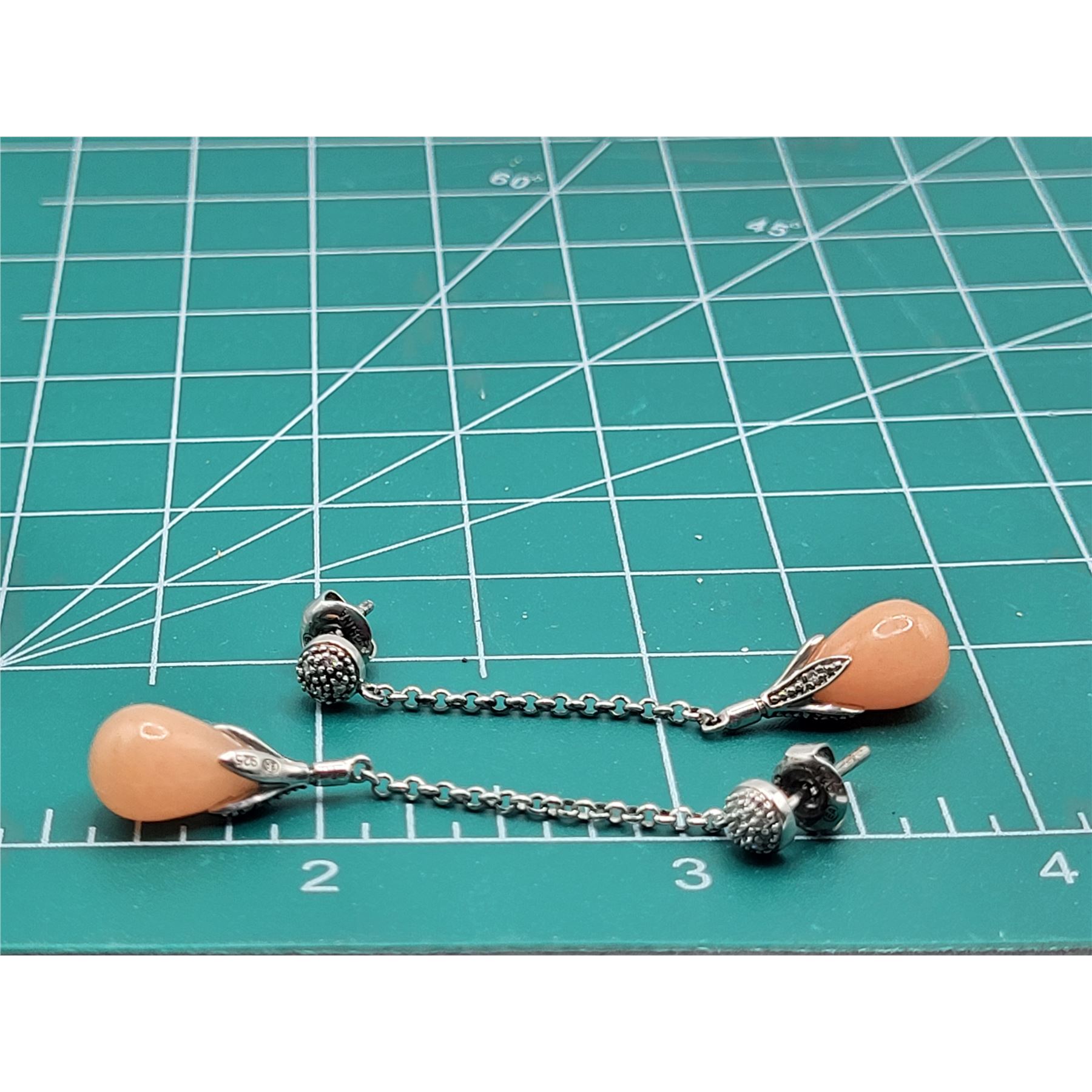 This pair of sterling silver earrings features a lustrous set of polished, peach jadeite-like stones and accent diamonds. The gemstone drops measure approximately 8mm x 12mm. A fine sterling silver rolo link chain connects the peach jadeite? and floral cap to a diamond accented small button on the earlobe.& nbsp; The earrings dangle approximately 2& quot; and attach with posts and friction backs.& nbsp; & nbsp;Admin: 33122/4g