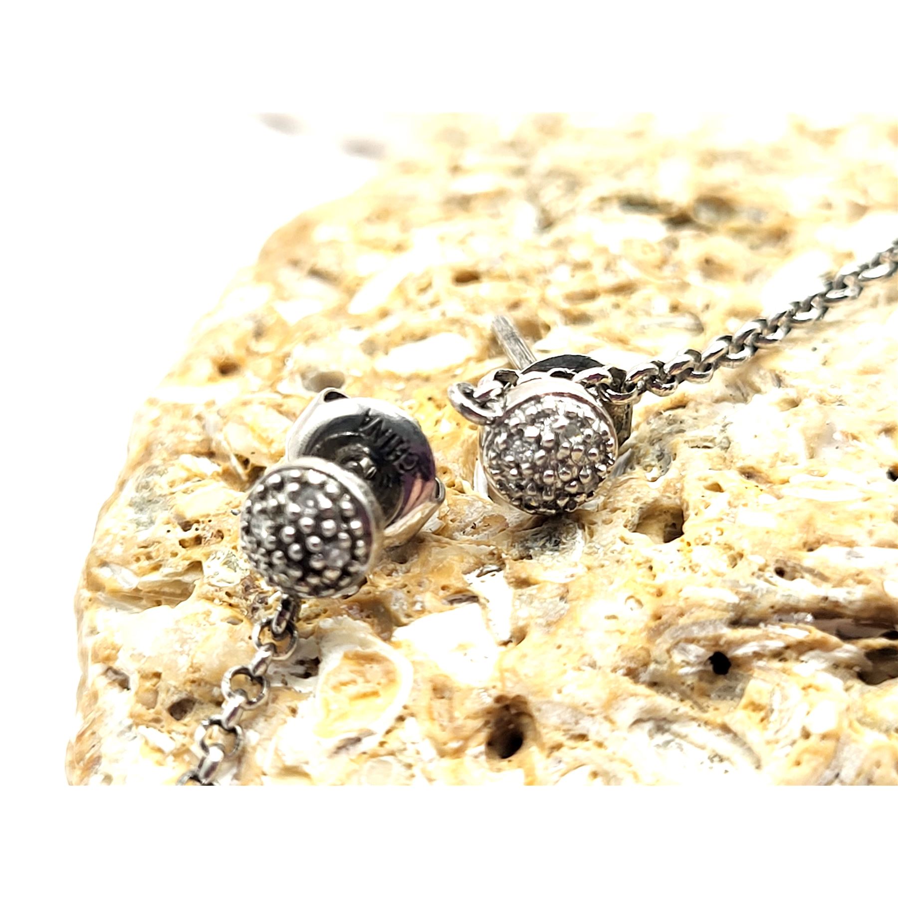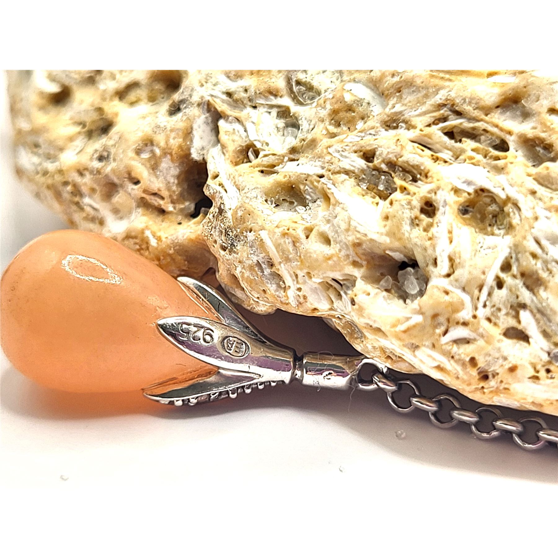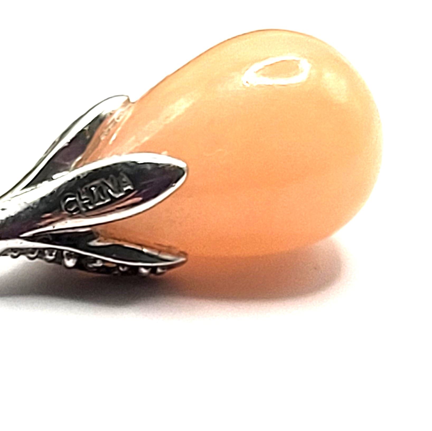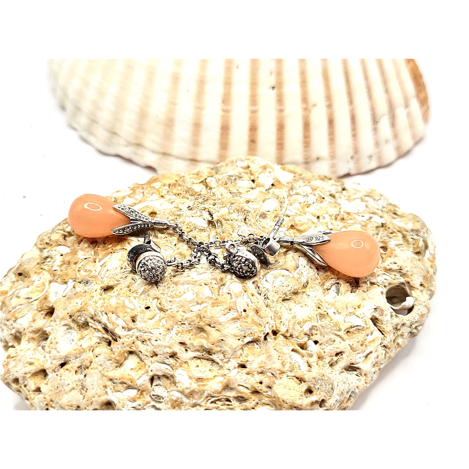 This pair of sterling silver earrings features a lustrous set of polished, peach jadeite-like stones and accent diamonds. The gemstone drops measure approximately 8mm x 12mm. A fine sterling silver rolo link chain connects the peach jadeite? and floral cap to a diamond accented small button on the earlobe.& nbsp; The earrings dangle approximately 2& quot; and attach with posts and friction backs.& nbsp; & nbsp;Admin: 33122/4g