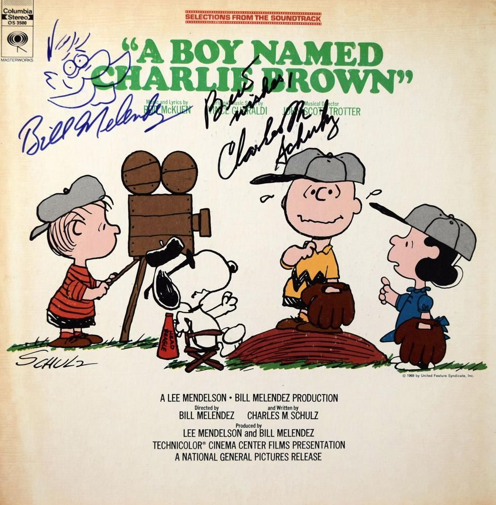 Peanuts 1969 A Boy Named Charlie Brown soundtrack album. Signed: Best Wishes, Charles M. Schulz & Bill Melendez with face drawing.