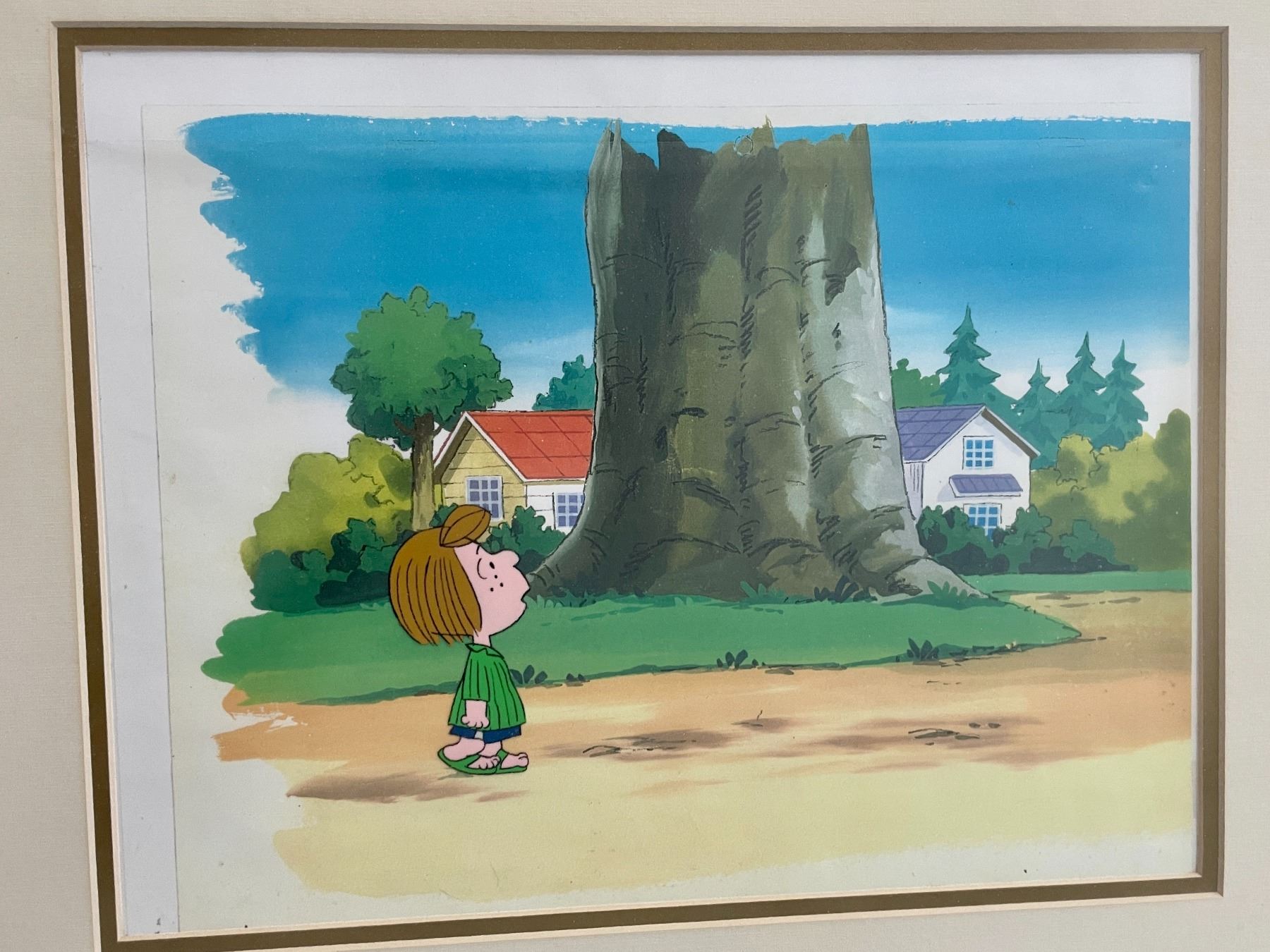 Peppermint Patty from Charles M. Schulz Peanuts characters. Bill Melendez animation cel on hand painted background. Framed and matted. Rare.17x21 inches