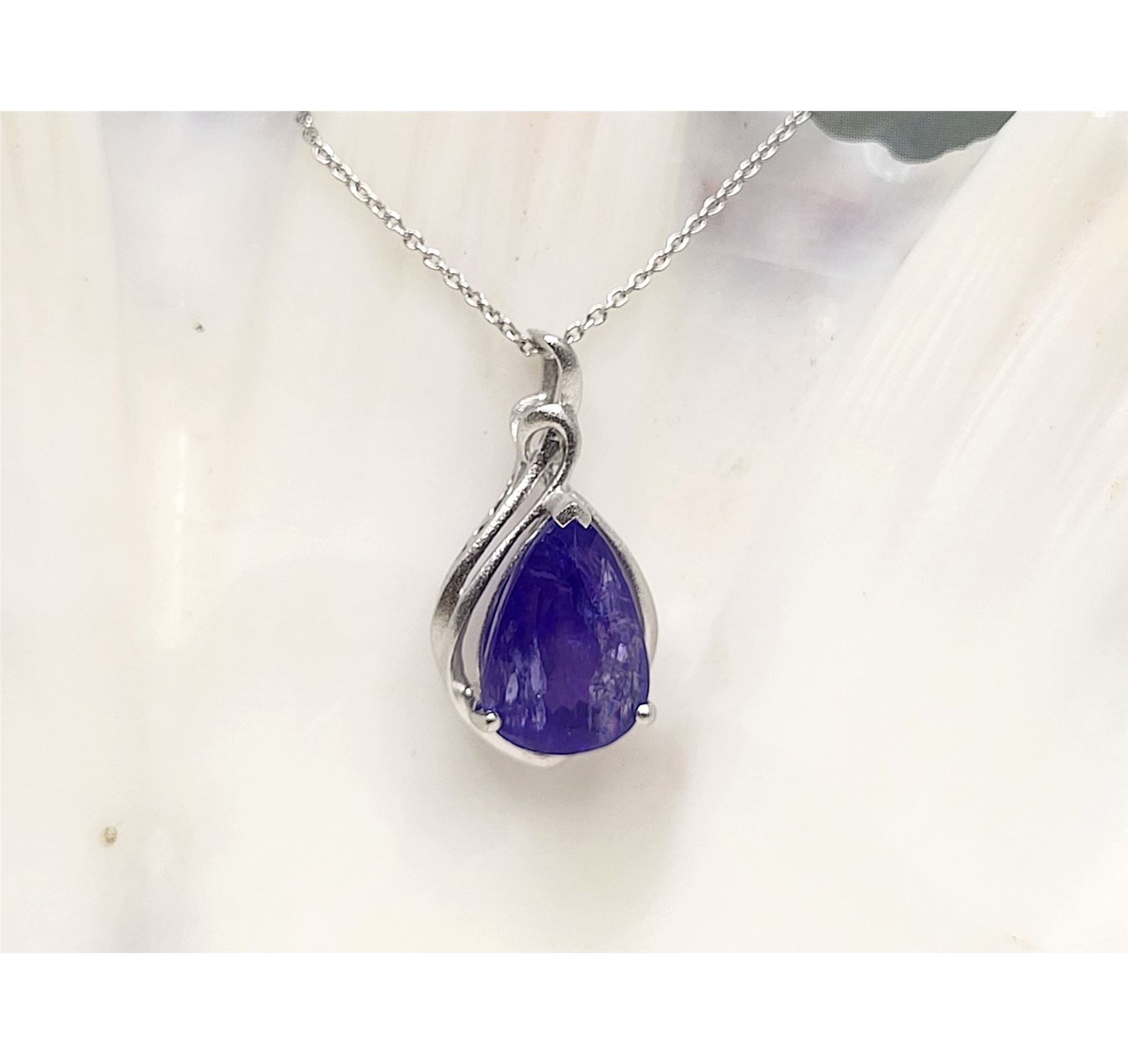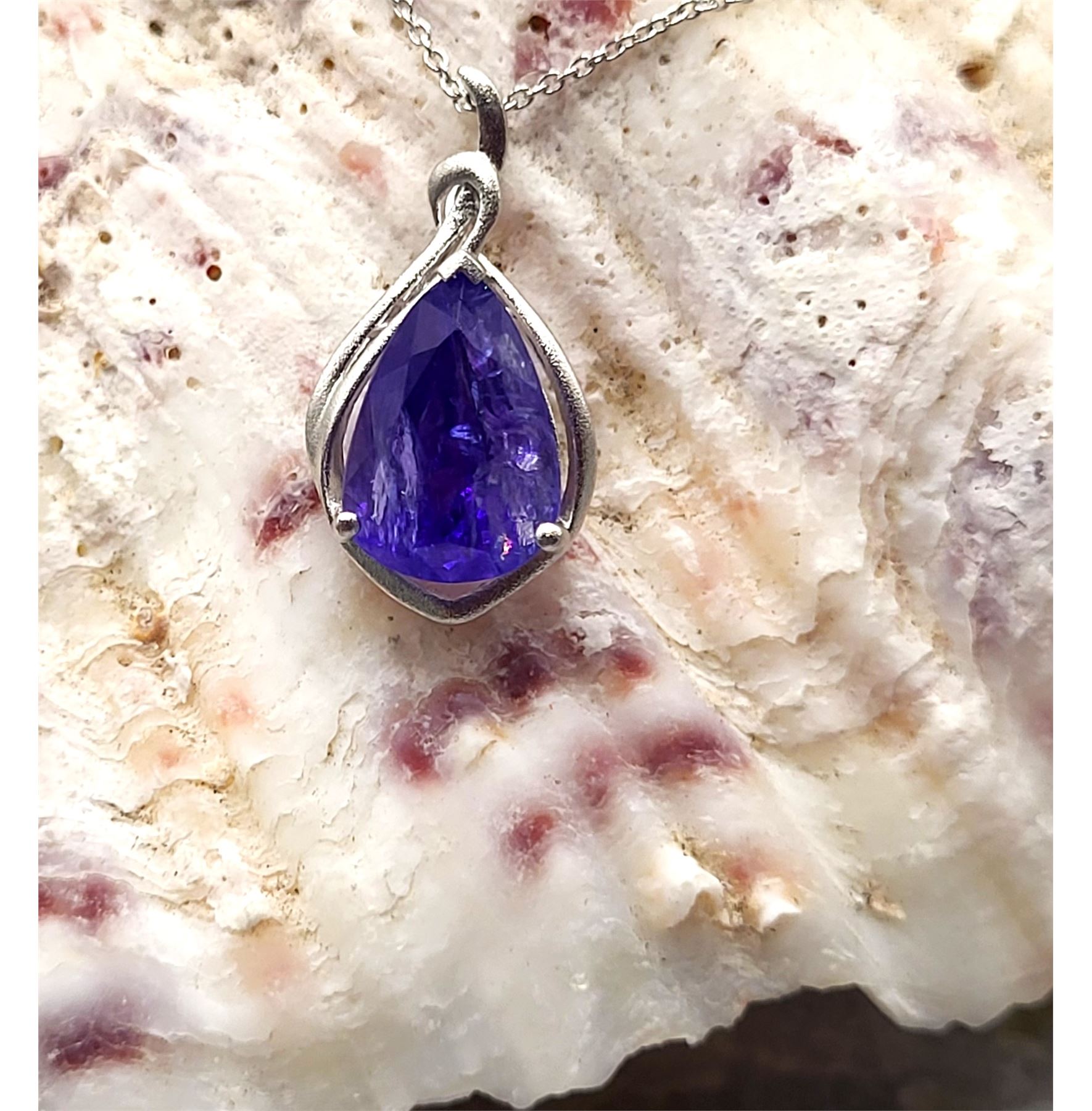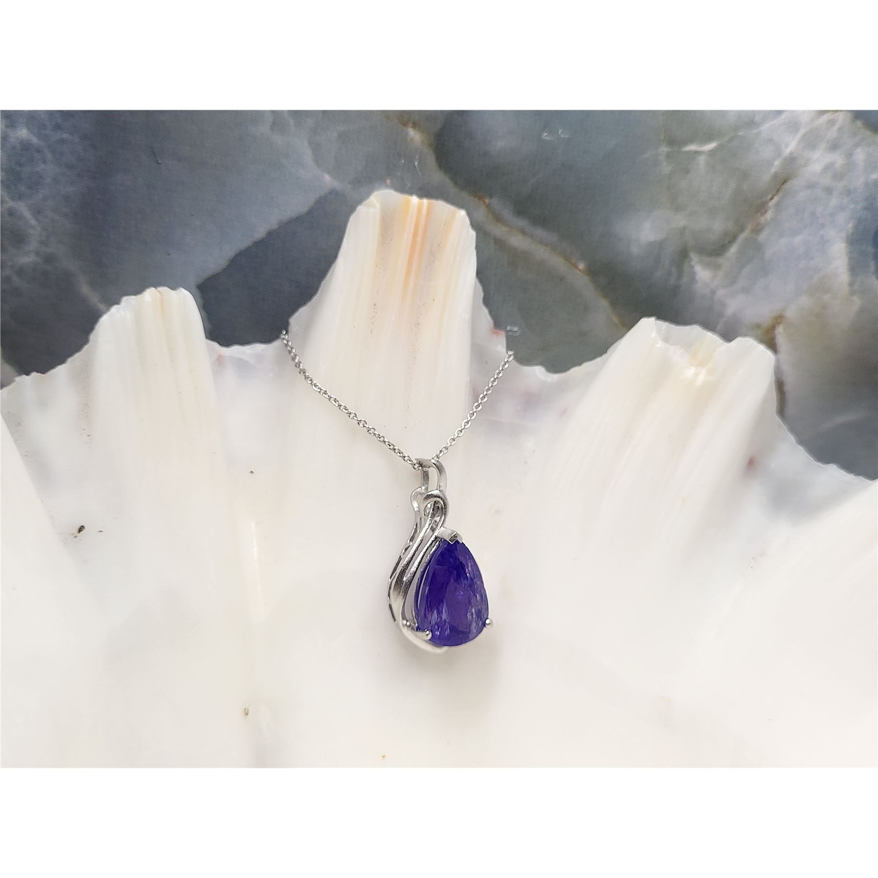 The bright and shiny sterling silver necklace features a 5.92 carat, pear-cut, genuine Tanzanite in a pendant with a swirled gallery and solid hidden bail. The pendant hangs from an 18& quot; fine chain of sterling silver with a spring ring clasp. The bail has an opening that can accommodate approximately up to a 3mm wide chain.