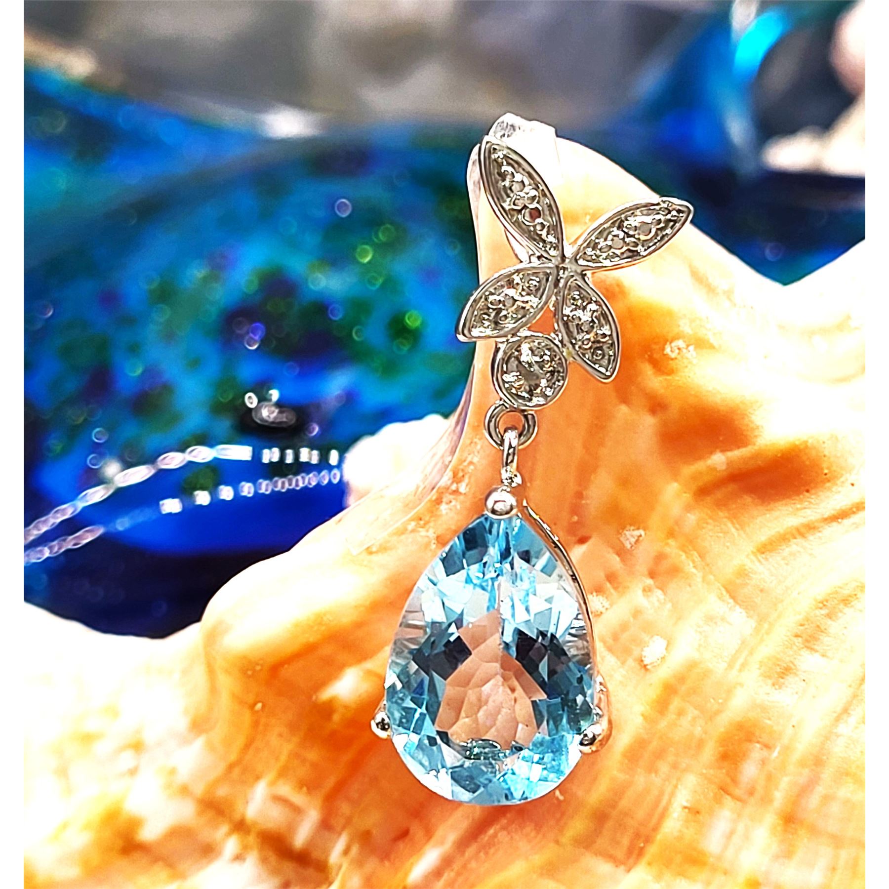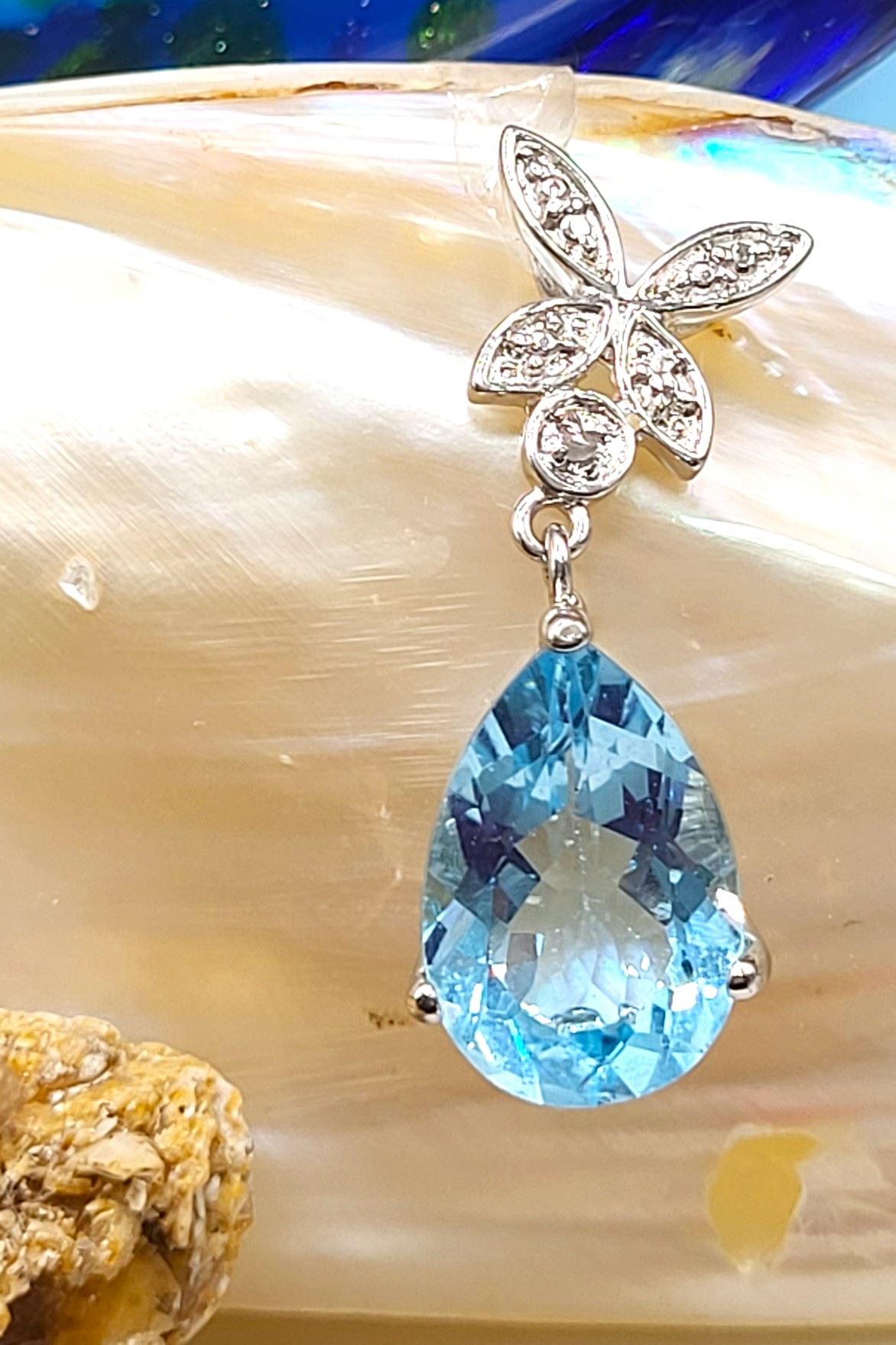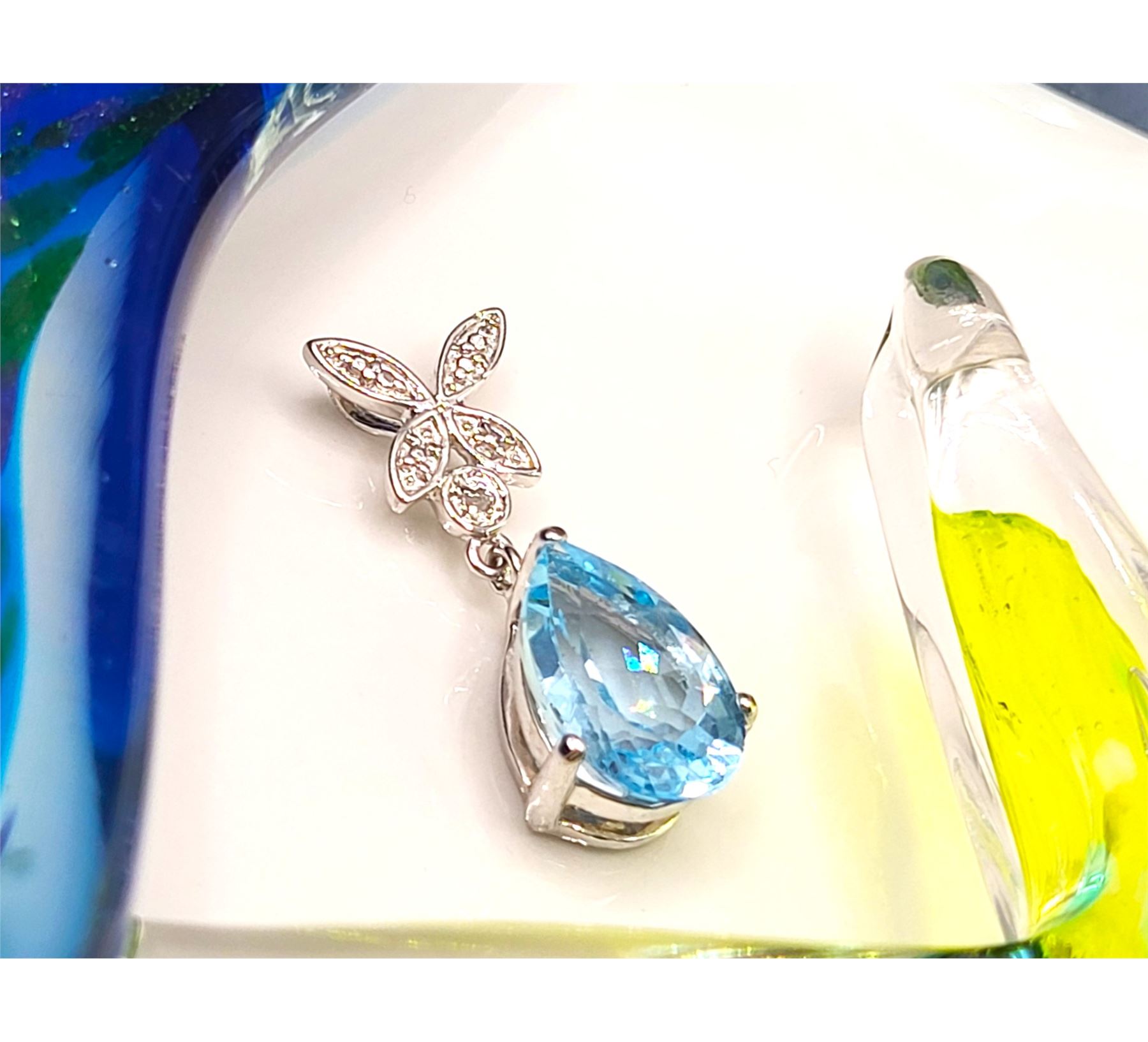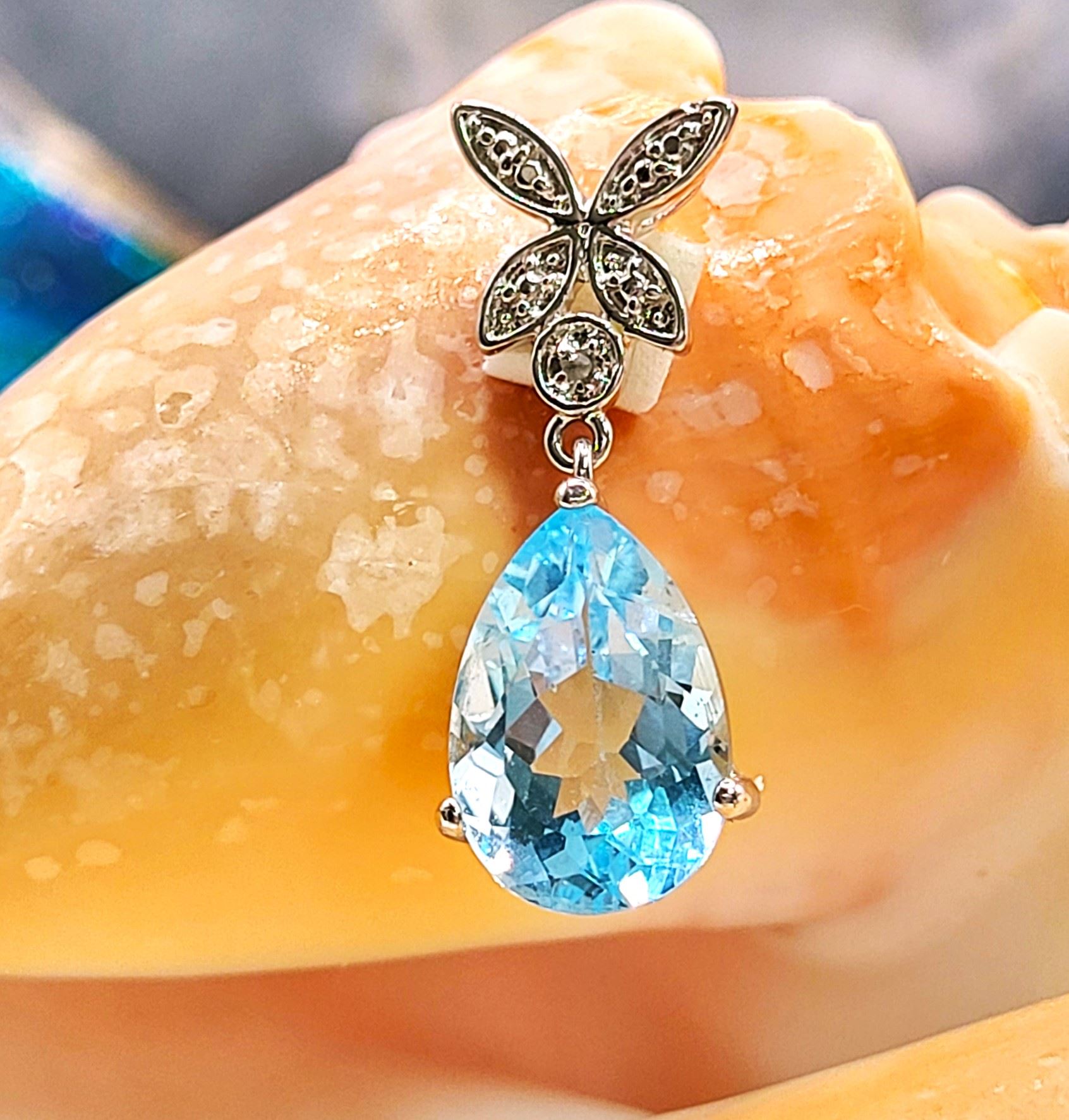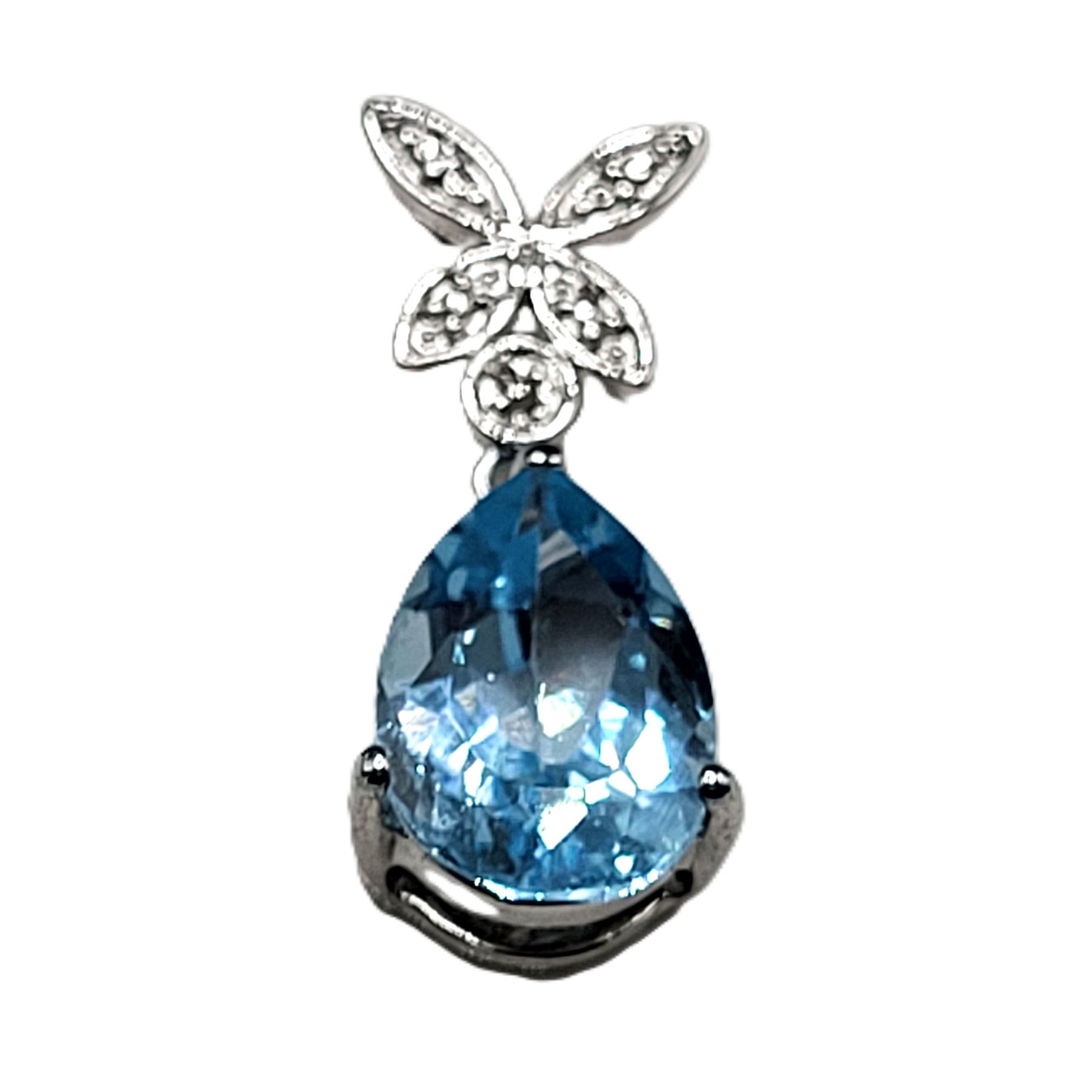 This STERLING SILVER pendant features an approximate 7.00 carat pear-cut, genuine prong-set blue topaz with a color between Sky Blue and Swiss Blue.& nbsp; This teardrop-shaped blue topaz dangles by jump rings from beneath the butterfly bail and has a small, polished accent diamond.& nbsp; The hidden bail (behind the butterfly) can accommodate an approximate ....mm chain.& nbsp; This pendant bears the hallmark & quot;DBJ& quot;, & nbsp; possibly for Jasco Designs Inc, New York, since around 1990.