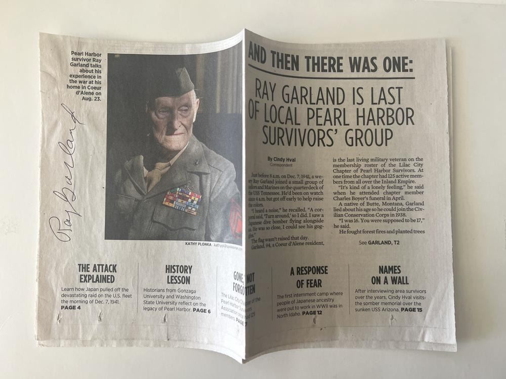 Pearl Harbor Survivor Ray Garland signed newspaper clipping