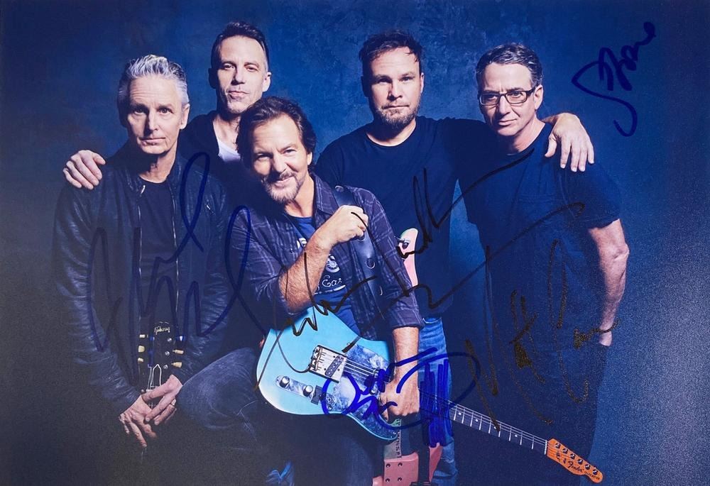Pearl Jam band facsimile signed photo autographed by Eddie Vedder, Jeff Ament, Stone Gossard, Mike McCready, and Matt Cameron. 8x10 inches. This item is a reprint of an original autograph