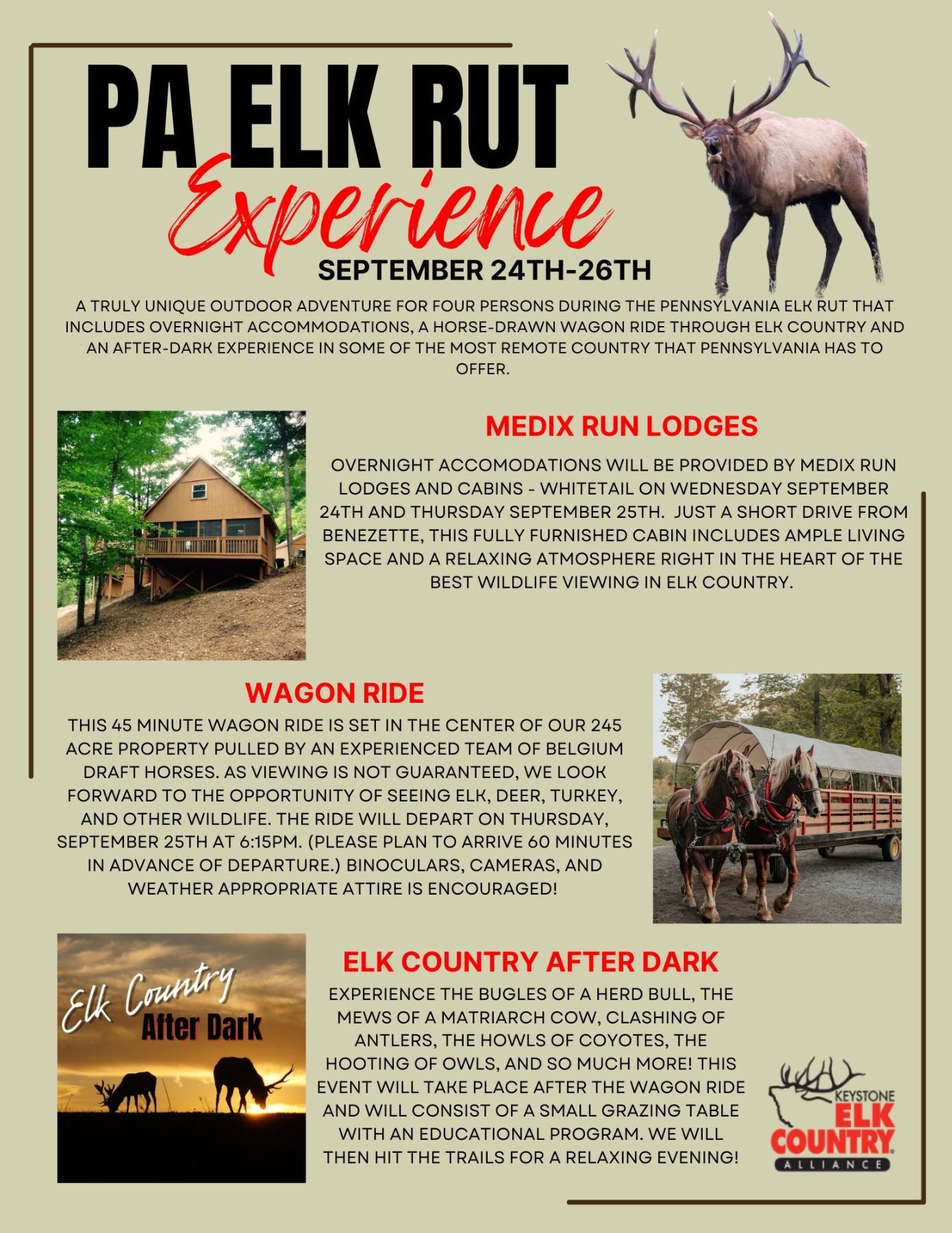 Includes overnight accommodations, a horse-drawn wagon ride through Elk Country and an after-dark experience in some of the most remote country that Pennsylvania has to offer.