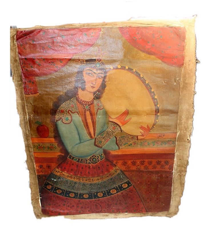 Persian Qajar painting oil on canvas, with female figure. Size 35 x 27 inches. Fine paitning of woman dancing holding a drum.