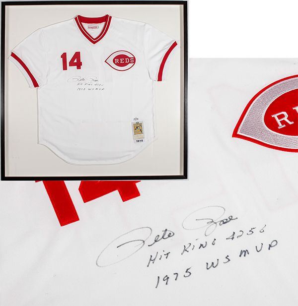 Pete Rose Signed Jersey From Cooperstown Authentic Collection. Limited edition, 17/75, No. 14 Reds Jersey is signed "Pete Rose." Below the signature is "Hit King 4256" and below that is "1975 WS MVP. Framed to 40� x 42 in. and ready to display. A specially prepared label for a limited edition of 75 signed jerseys from the Cooperstown Authentic Collection is sewn to lower right.
