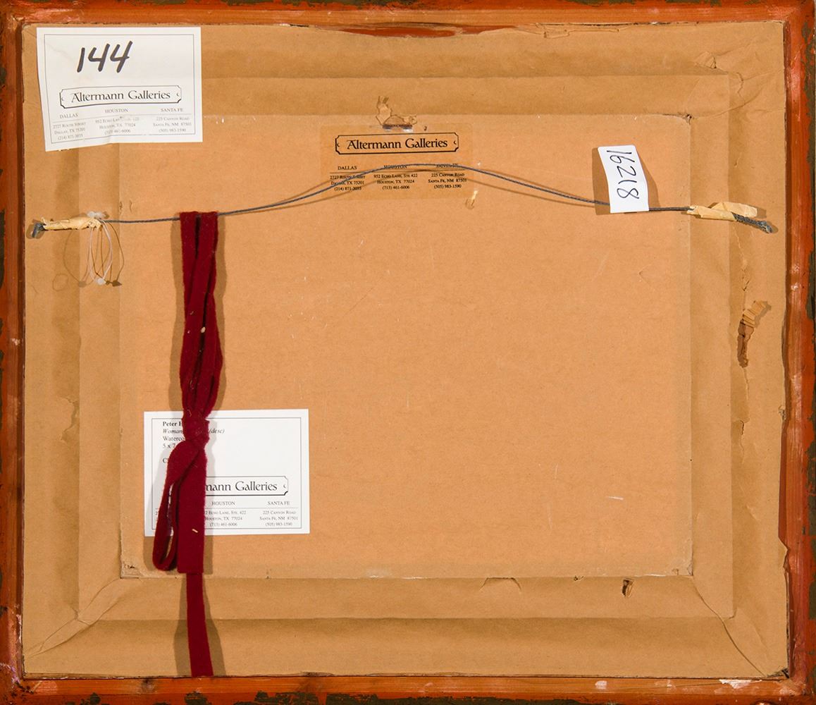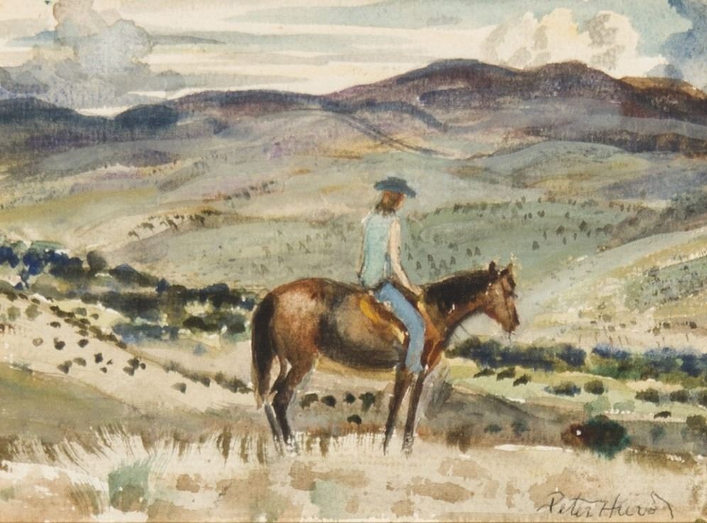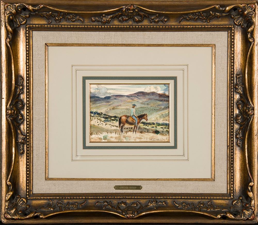 Artist: Peter Hurd; Title: Woman on Horse; Medium: Watercolor; Dimensions: 5 x 6 3/4 inches; Signed: Signed lower right; Framed/Base: 19 x 22 inches