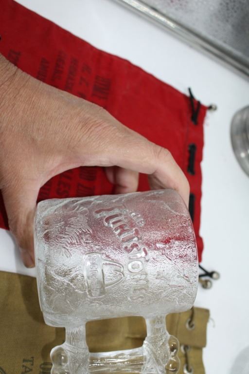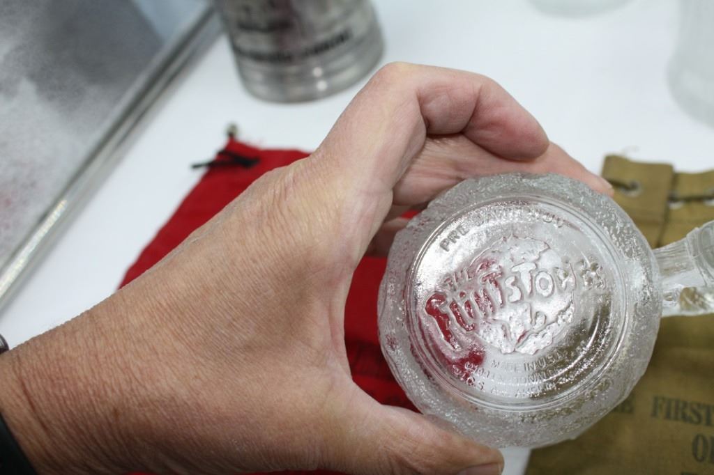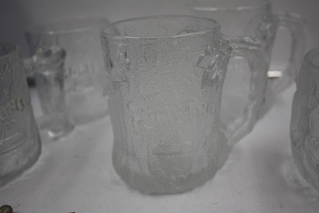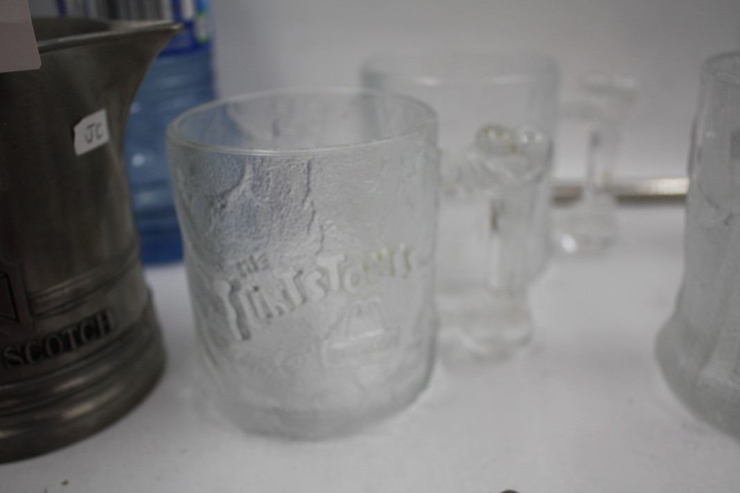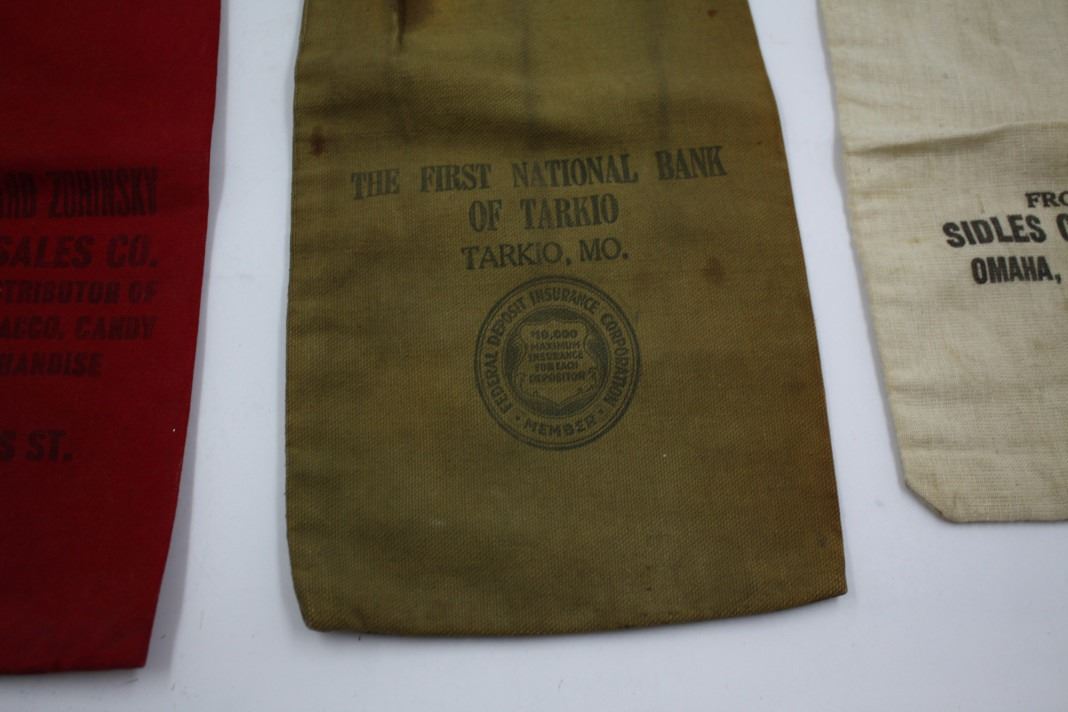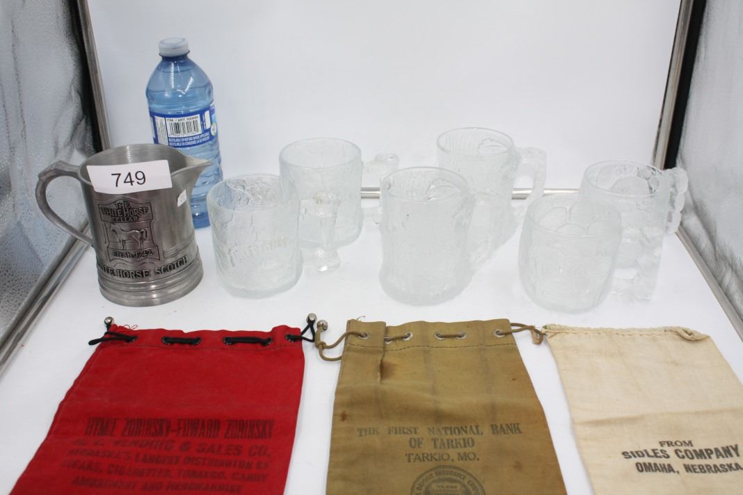 3 Small Vintage Bags: Hymie Zorinsky-Edward Zorinsky, The First National Bank of Tarkio, Sidles Company 6 Mac Donald Flintstones Glass Mugs