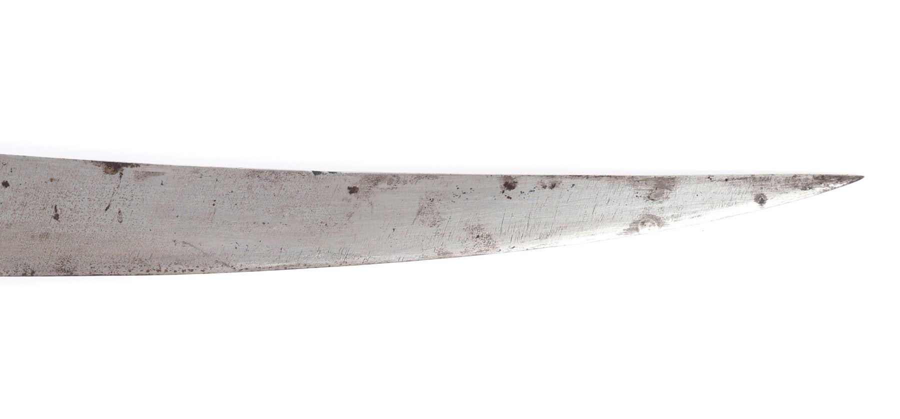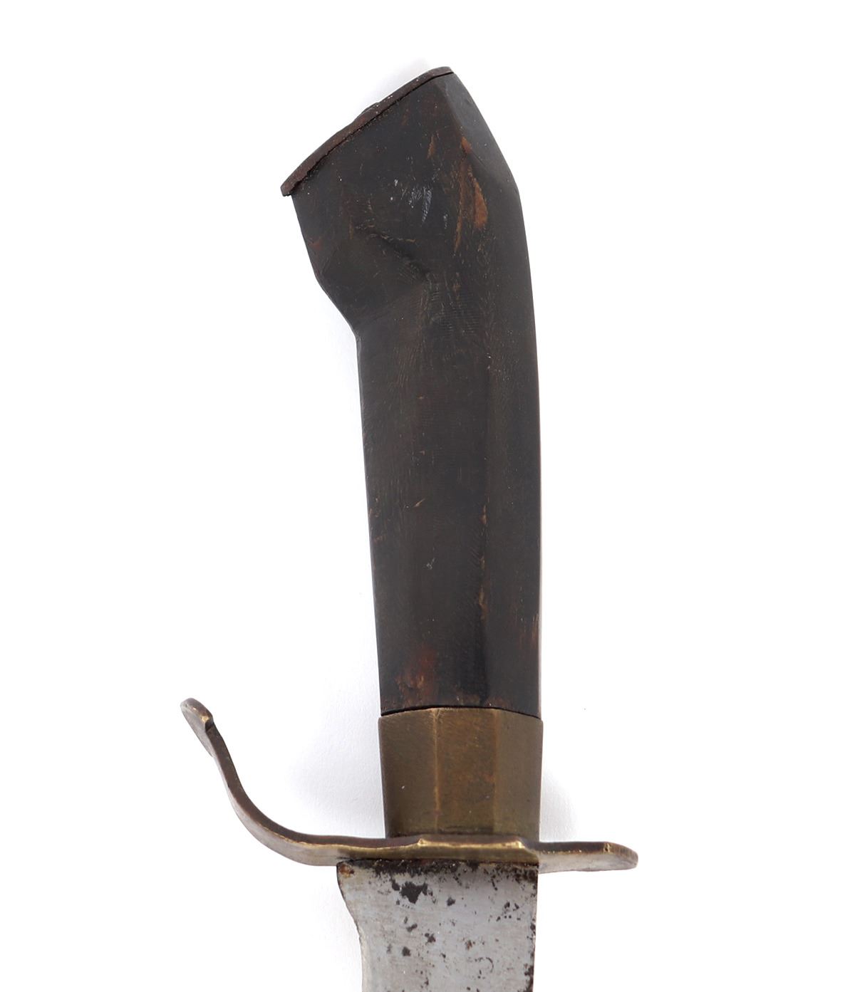 Philippines Archipelago, Luzon, probably First Republic period or 19th century Spanish American War (1898). The blade a long slender double edge with a curved lower side that terminates to a sharp point effective for cutting and thrusting. Handle in carabao horn with brass mounts and an upturned guard in brass as well. Probably a laminated steel blade with cleaning more visible. Spanish-American War-era bolo of the Philippines is generically called as itak, tabak, or sundang. Size: 23 3/8" L, blade 17 1/4" L. Condition: Very good condition overall, blade without damaged or resharpened tip. Light surface corrosion to the unremoved tang, minor loss to section of horn handle