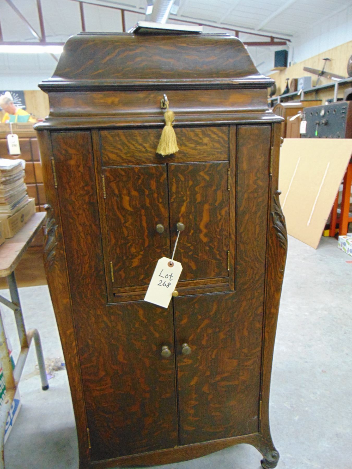 Upright Victor Talking Machine; model VV XV victrola; in L cabinet; excellent condition; plays very nicely; with crank and key; Victrola record book by Mike Sherman; rare