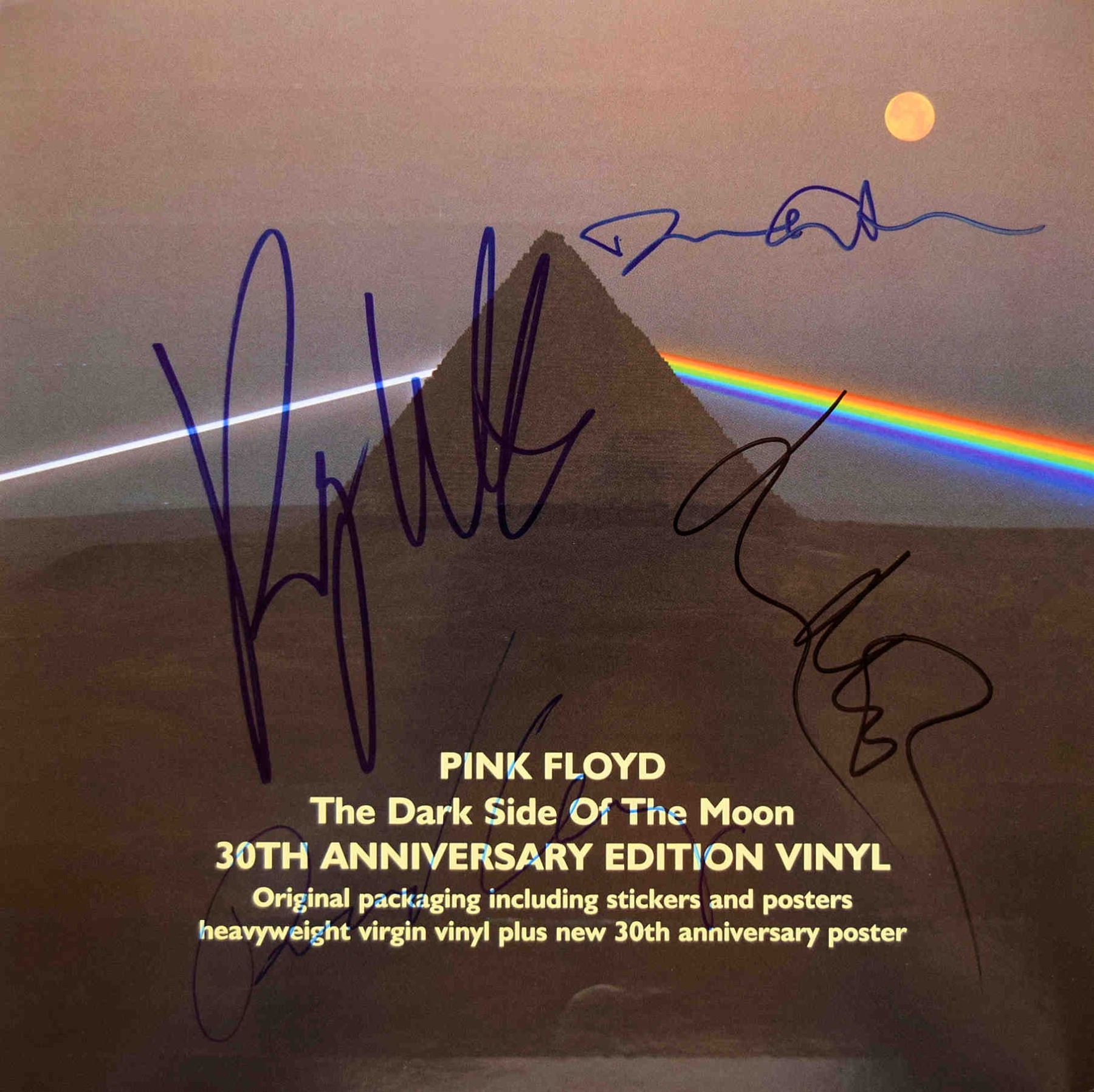 Pink Floyd Band Signed record insert sticker. 10 x 10 inch signed by Roger Waters, Richard Wright, David Gilmour and Nick Mason