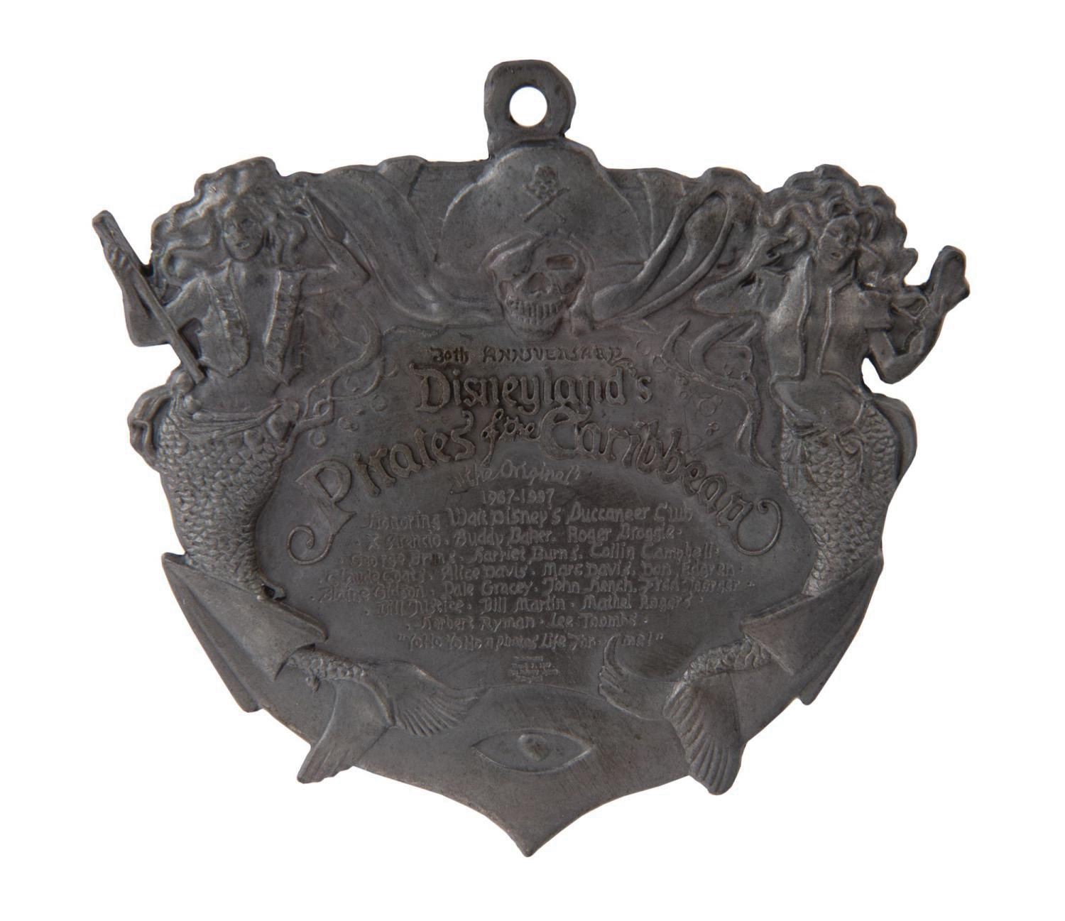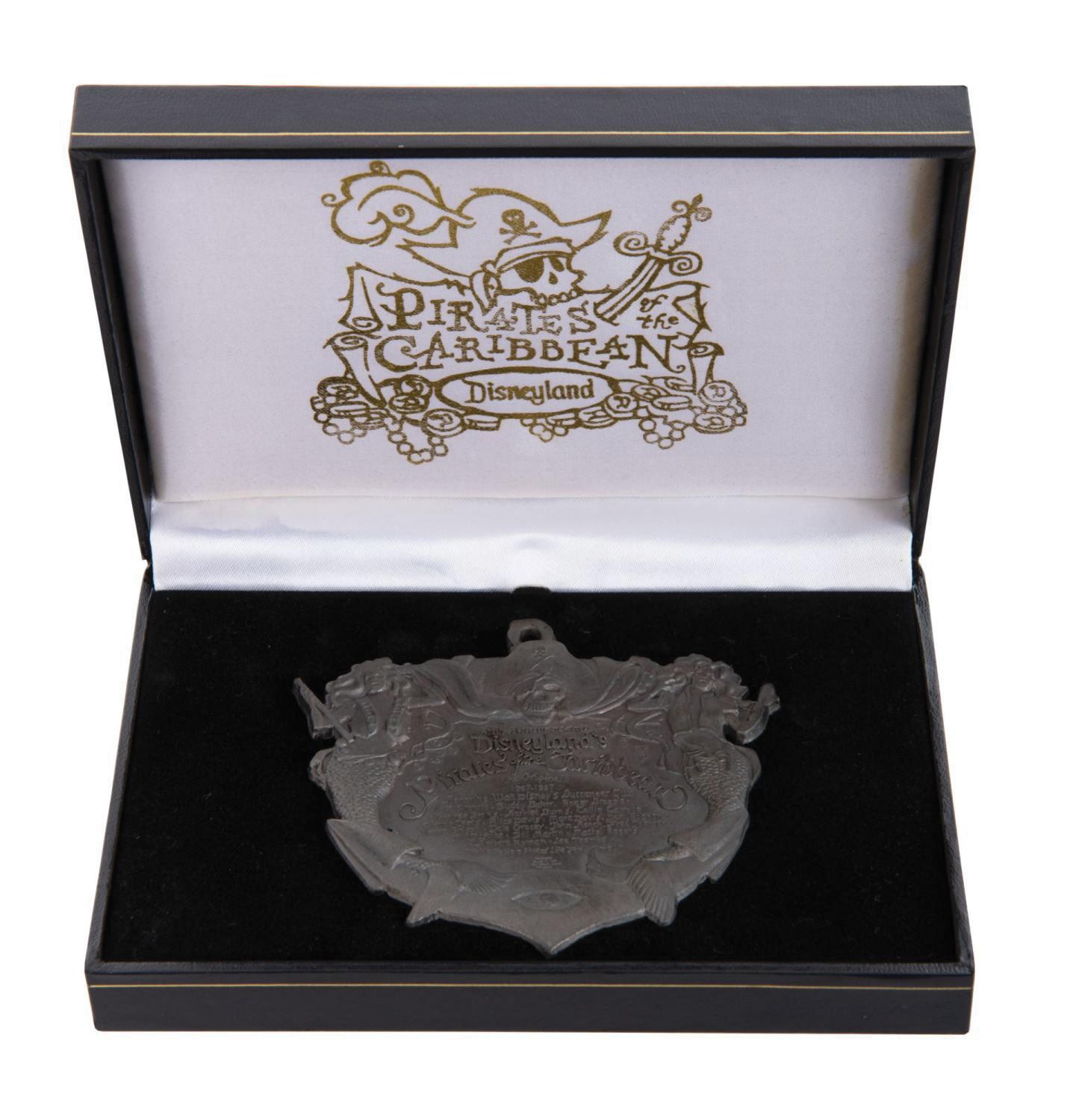 (Disneyland, 2001) A limited edition Pirates of the Caribbean plaque pin. This gorgeous metal pin replicates the 30th anniversary plaque which hangs in the attraction's entrance at Disneyland, honoring the members of Walt Disney's original Buccaneer Club. Measuring 3.5"x3.75", the commemorative pin is in fine condition and comes in its original hinged jewelry box. The leatherette box measures 4.5"x6.25" and bears the Pirates' emblem on the inside of the lid.