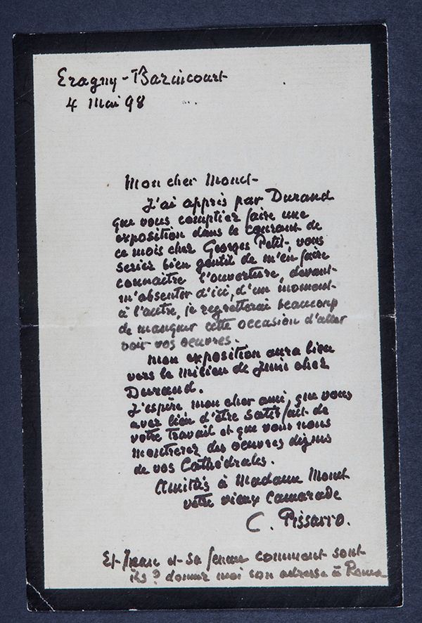 Friendly regards to Madame Monet. Your old comrade C. Pissarro." In a postscript, he writes, "And how are Jean and his wife? Give me his address in Rouen."