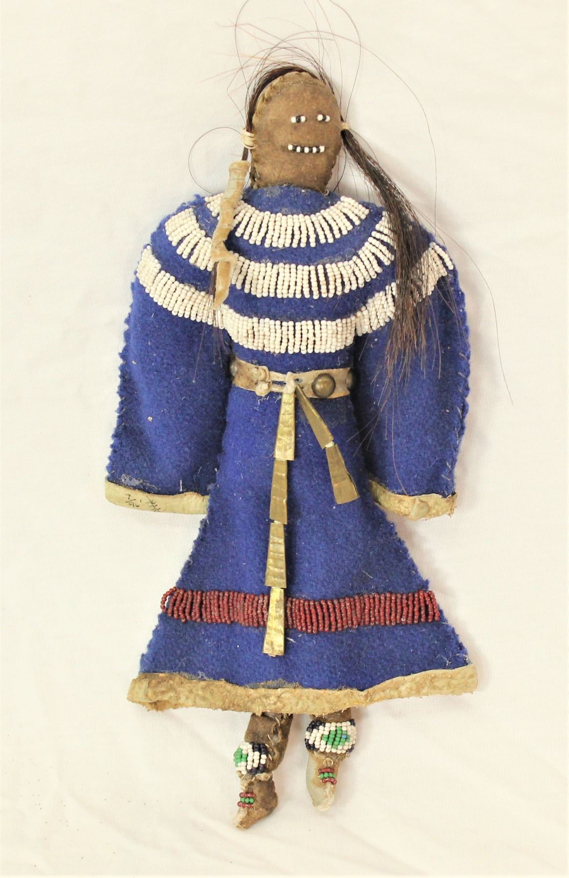 Sioux Indian early 20th Century doll with nicely beaded tradecloth dress. Standing 11 1/2" tall.
