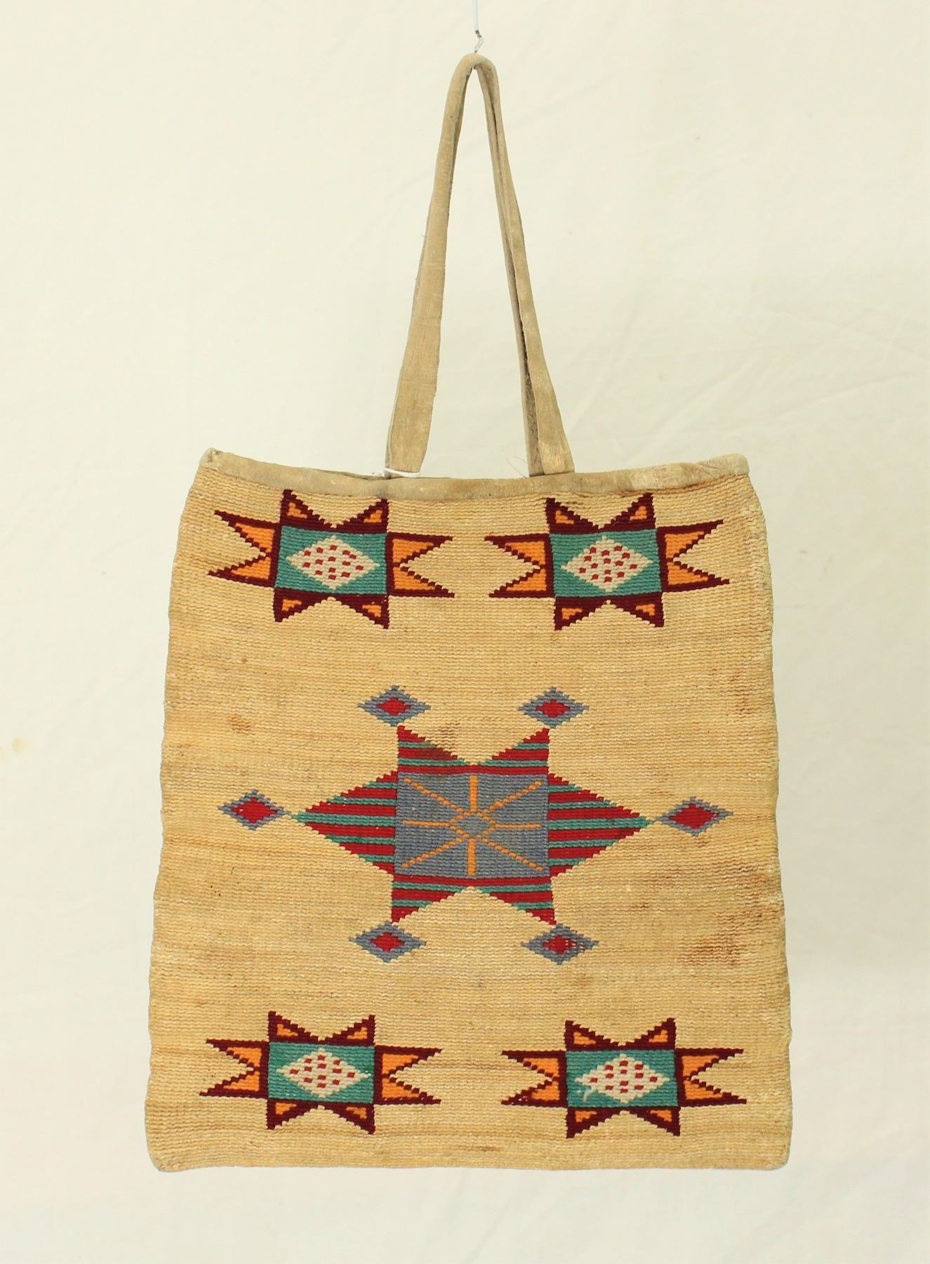 Eye catching corkhusk bag with a colorful geometric pattern on both sides, measuring 10"x 11".