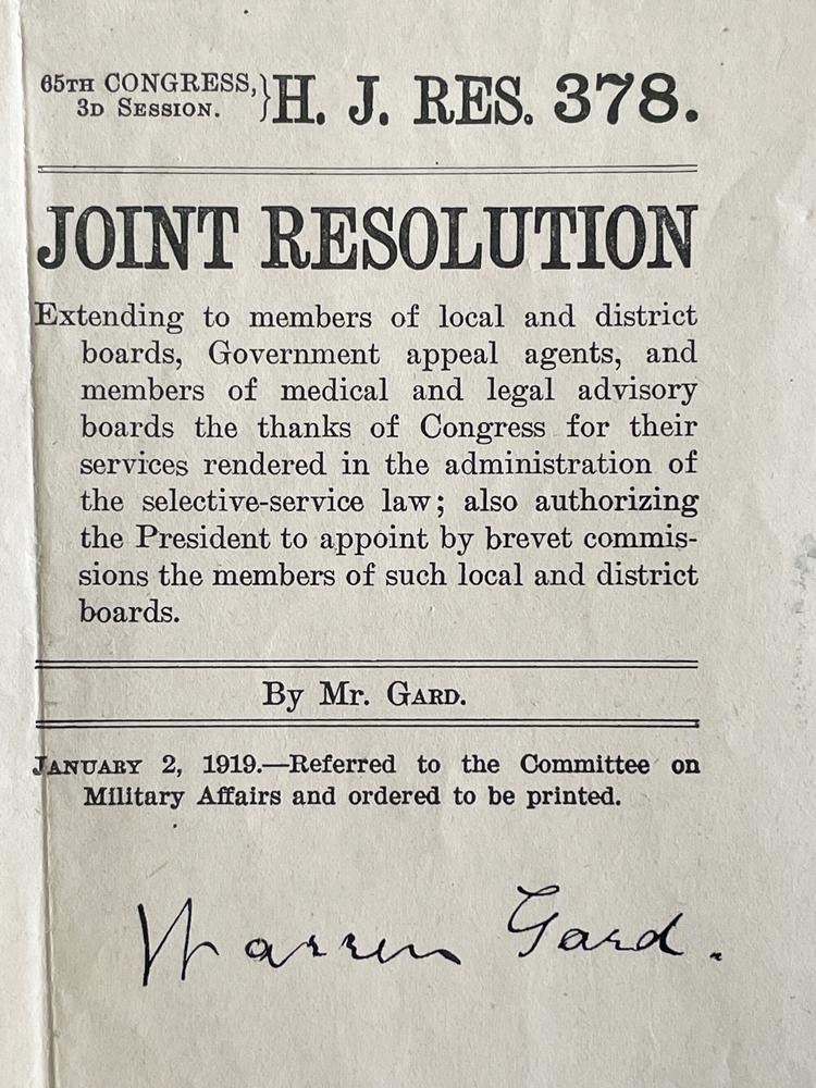 Political Resolution 1919 Warren Gard signed letter. 8x11 inches