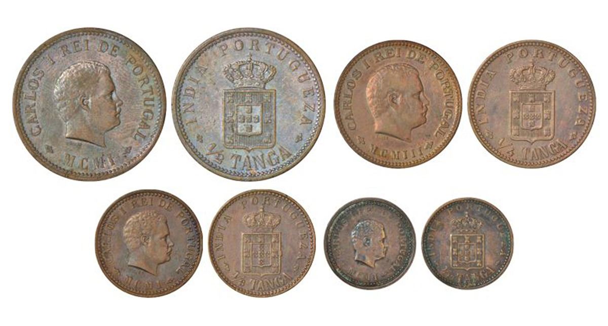 Portuguese Administration, D. Carlos I (1889-1908 AD), set of 4 copper coins, 1x ½ tanga, (1901), KM 16; 1x ¼ tanga, (1903), KM 15; 1x ⅛ tanga, (1901), KM 14 and 1x 1/12 tanga, (1901), KM 13. Obv: Portrait bust of Carlos I. Rev: Crowned shield within wreath. (4 coins)