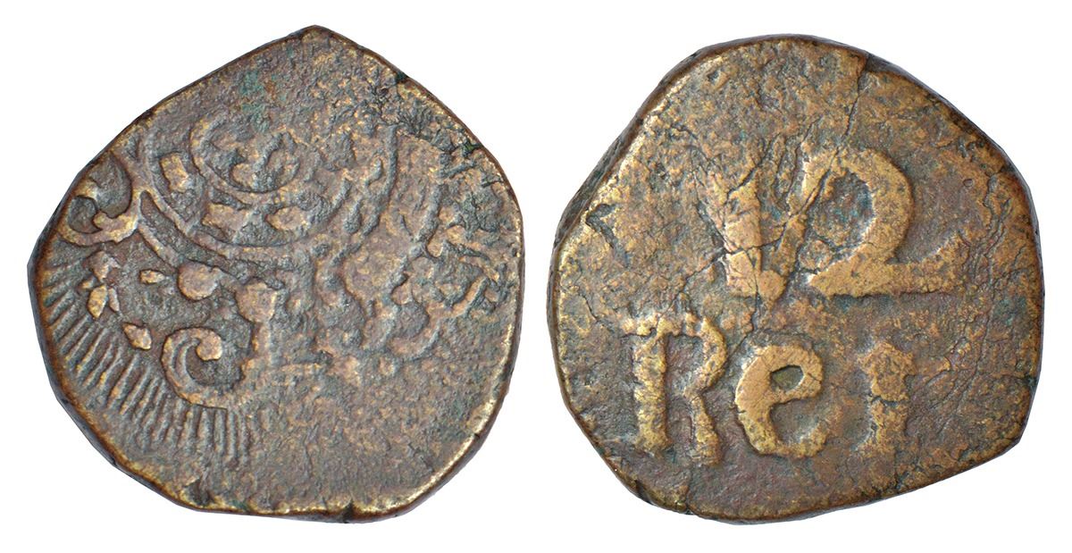 Portuguese India, D. Joao VI (1816-1826 AD), Goa, copper 12 reis, KM 215. Obv: Crowned oval arms. Rev: Value.