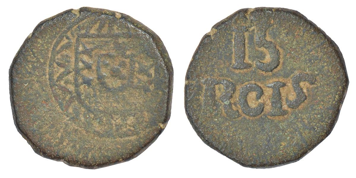Portuguese India, D. Joao VI (1816-1826 AD), Goa, copper 15 reis, KM 232. Obv: Crowned arms. Rev: Value.