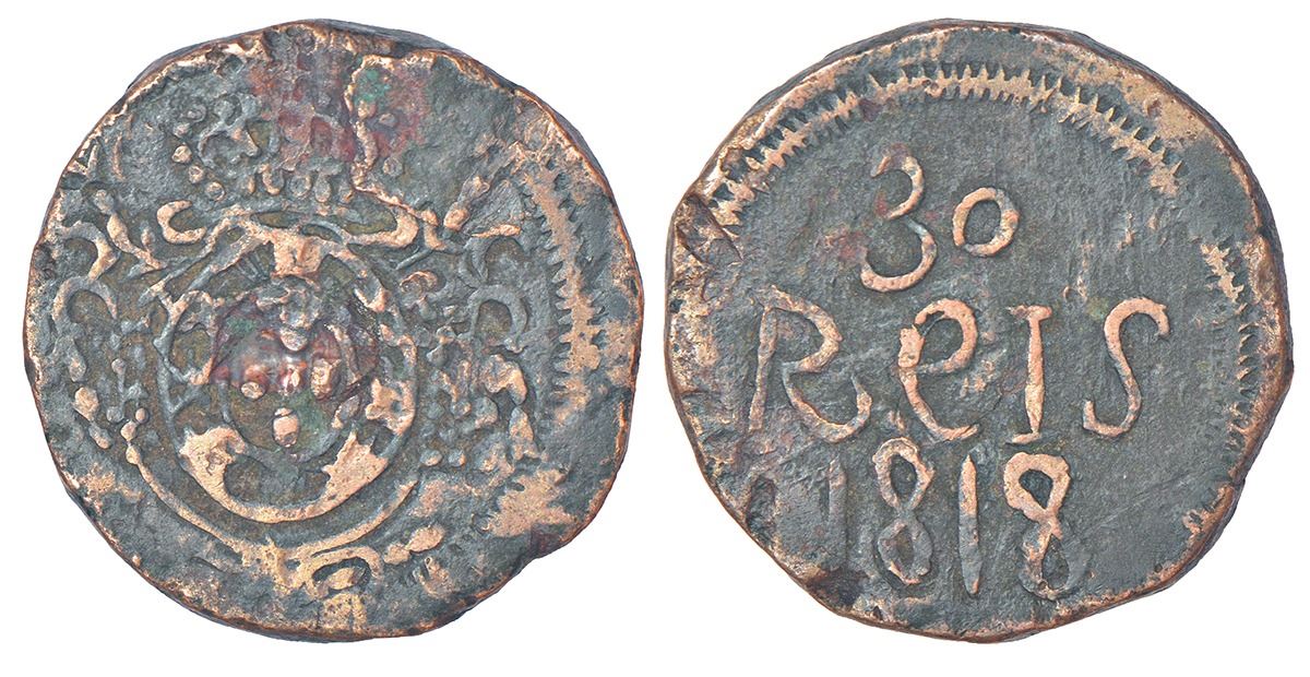 Portuguese India, D. Joao as Prince Regent (1799-1816 AD), Diu mint, copper 30 reis, AD 1818, KM 54, 18.78g. Obv: Crowned arms. Rev: Denomination and date.