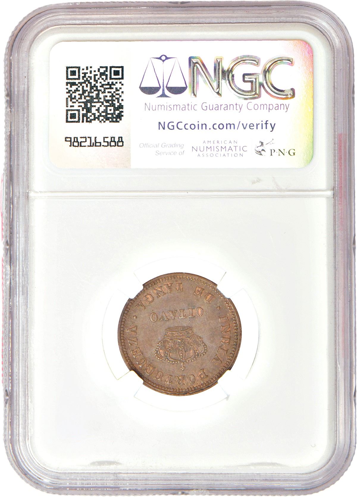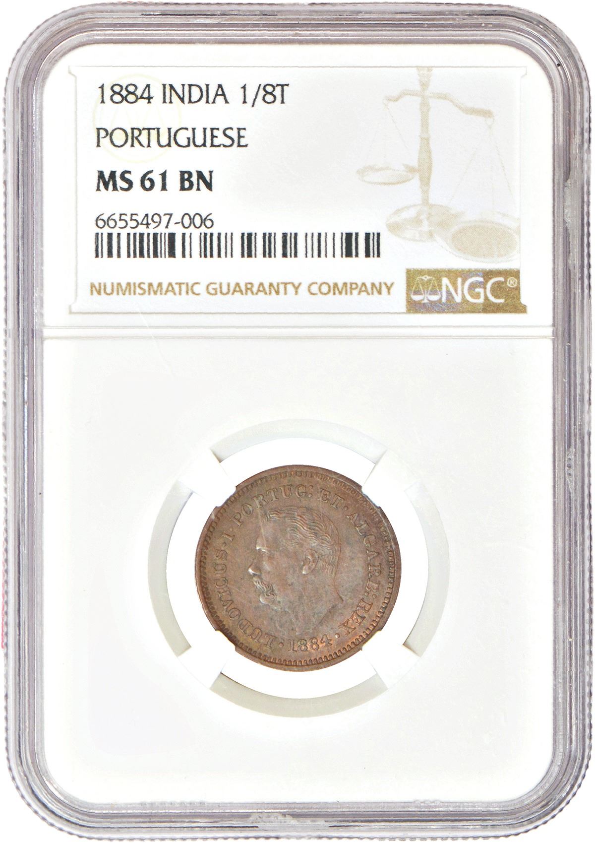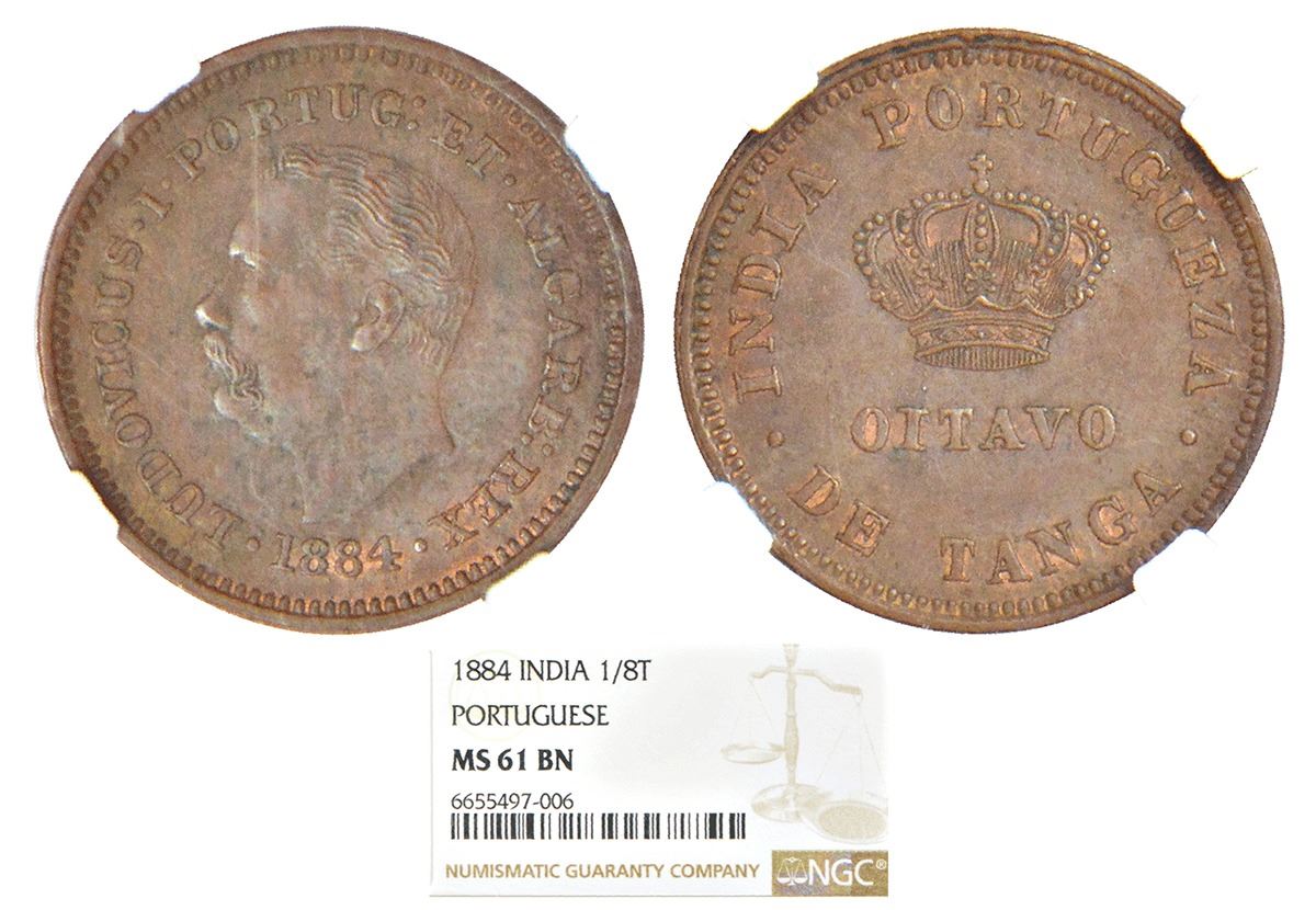 Portuguese India, D. Luiz I (1861-1889 AD), colonial coinage, machine struck, copper ⅛ tanga, AD 1884, KM 307. Obv: Portrait bust of D. Luiz I. Rev: Crowned shield.