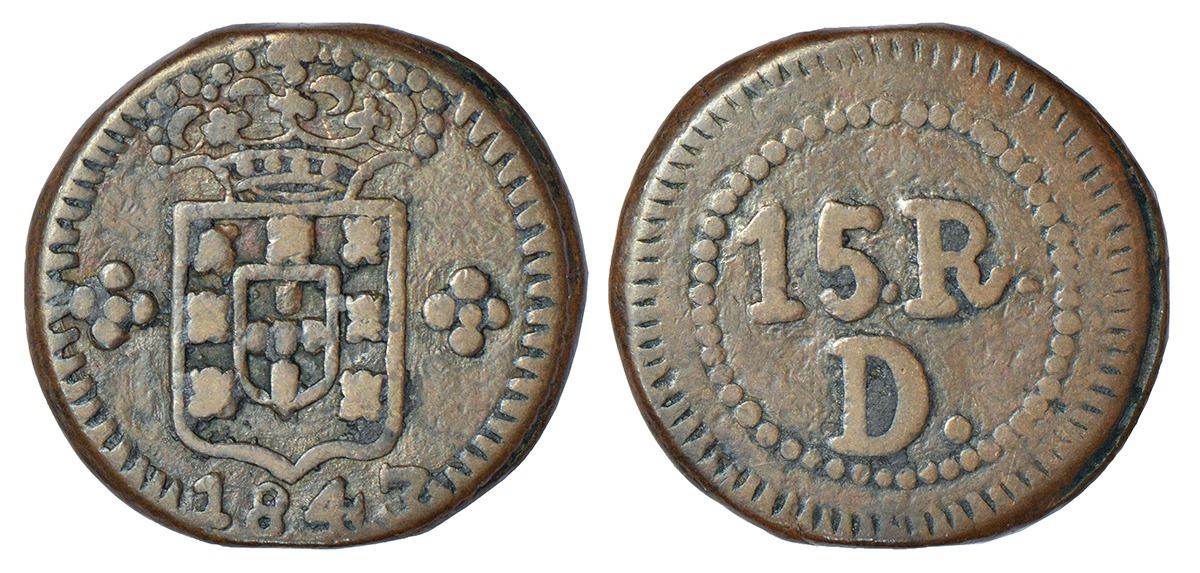 Portuguese India, D. Maria II (1834-1853 AD), Damao, copper 15 reis, AD 1843, KM 25, 9.15g. Obv: Crowned arms. Rev: Value within dotted border.