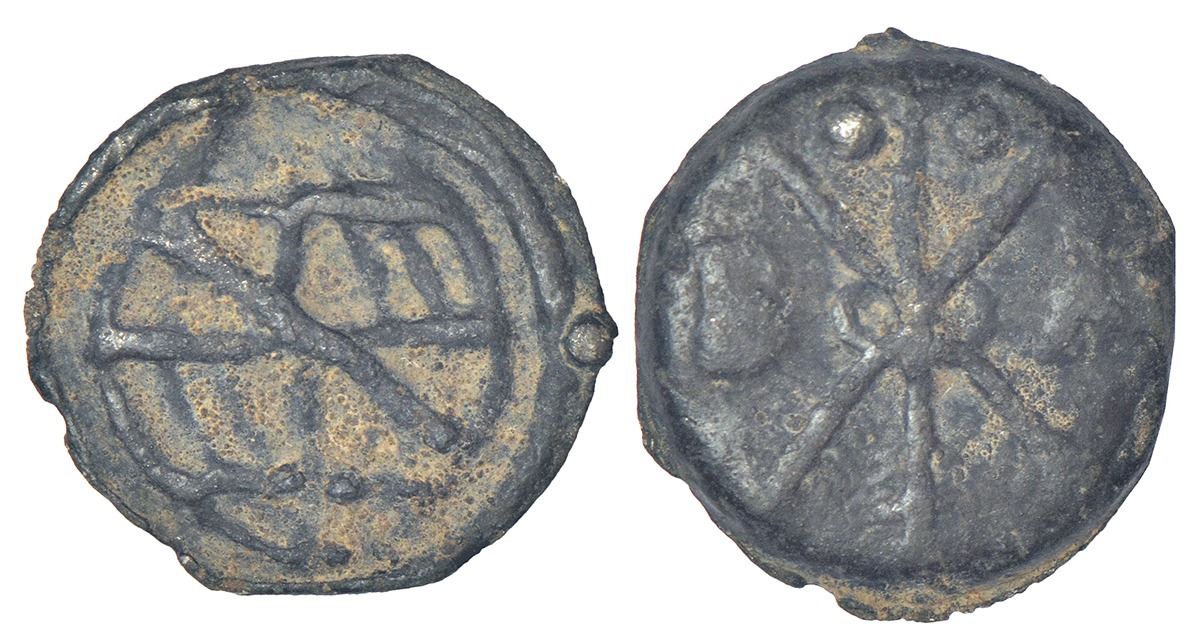 Portuguese India, D. Sebastiao I (1557-1578 AD), Malacca (Malaysia), tin 1 soldo, ND (1557-1578), 3.60g. Obv: Armillary sphere, diagonal at upper right. Rev: Three crossed arrow, dividing letter B.A, two dots above.