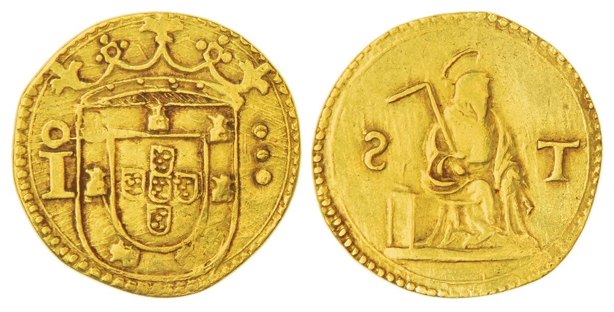 Portuguese India, Goa - gold Pardau de Sao Tome of João III o Piedoso, "the Pious", king of Portugal (1521-1557 AD), Goa mint, undated, Gomes 17.03, 2.95g. Obv: crowned Portuguese coat-of-arms; O/I and three dots flanking shield. Rev: St Thomas the Apostle seated right on block decorated with five pellets, pointing upward with right hand and holding carpenter's square; S (retrograde) and T on left and right.