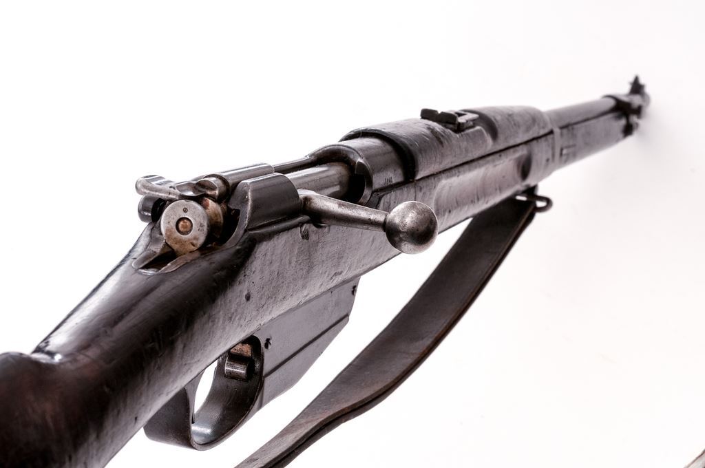 Portuguese Model 1896 Mannlicher Bolt Action Rifle, #A840, 6.5X53R cal., 24" barrel, blued finish, hardwood stock, inverted "V" front sight and adjustable folding leaf rear sight. Marked on top of receiver ring and right side buttstock with a "(crown) CI" for Portuguese King Carlos I; left side receiver rail marked "STEYR 1896". Left side receiver ring hand stamped by early U.S. importer "M1893/ ROOMANIAN/6.5x53R" (Model mis-identified and Romanian mis-spelled). Mismatched numbers. Includes cleaning rod and leather sling in good condition. Condition overall is good with the metal retaining approx. 75% finish. Wood is good showing bruises, handling marks, and overall darkening. Action operates smoothly, bore is fair with darkening and wear to the rifling. No recent import marks. Est.: $350-$500. (C&R)