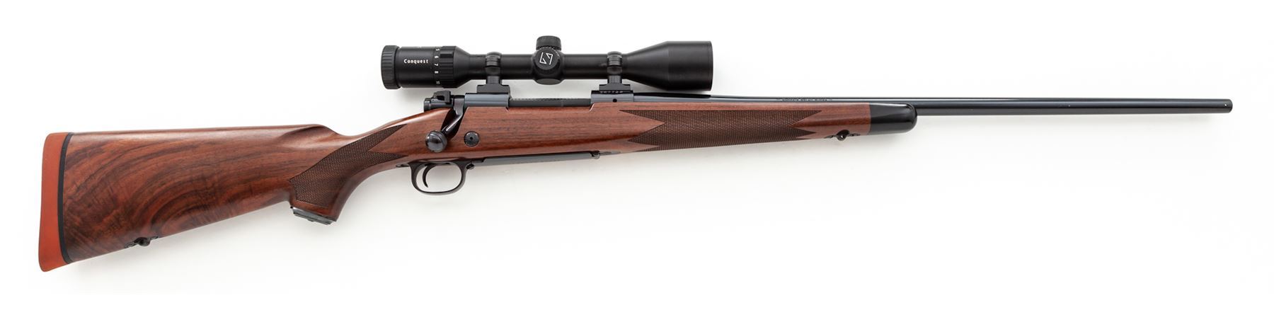 Post-64 Winchester Super Grade Bolt Action Rifle, #G47753, .270 cal., 24'' barrel, blue finish, checkered cheekpiece walnut stock, with factory red Winchester rubber butt pad. Topped with a Zeiss 3.5-10x44 MC scope on Leupold rings and mounts. Condition is excellent retaining approx. 98%+ original factory blue. Stock, action and bore are excellent. Scope optics, with duplex reticle, are bright and clear. Est.: $1,000-$1,500. (Modern)