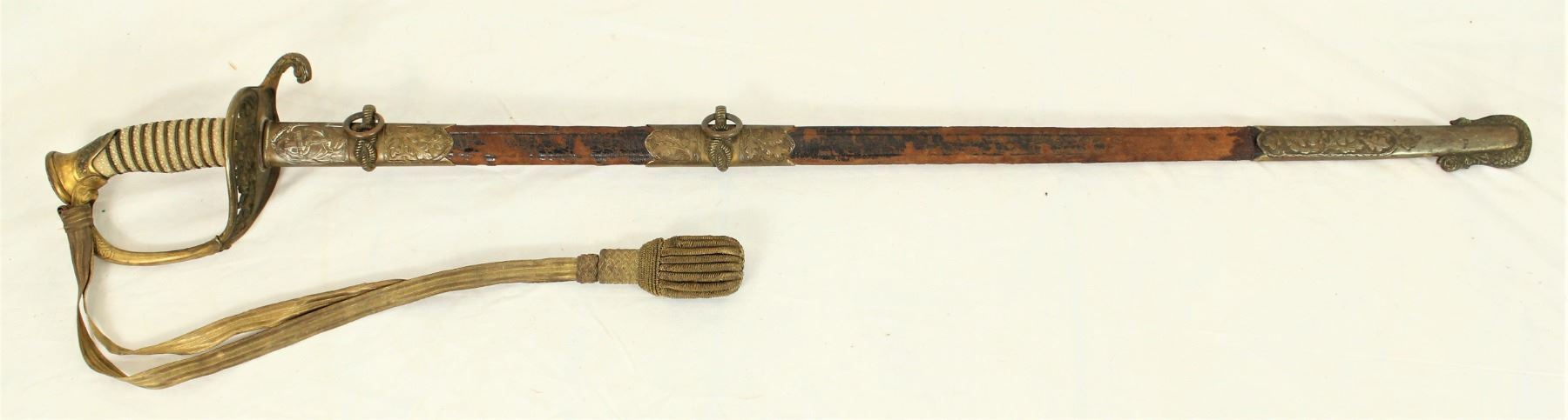 Presentation Sword, marked on sheath "Presented to COMDR. William L. McDonald / The Petty Officers / 7th Battn. / NMN / Nov. 21, 1929". Has a beautiful etched blade with "William L. McDonald" engraved, 28 3/4" blade, fancy D-guard with sting ray handle. NOTE: Embossed dolphin on handle.